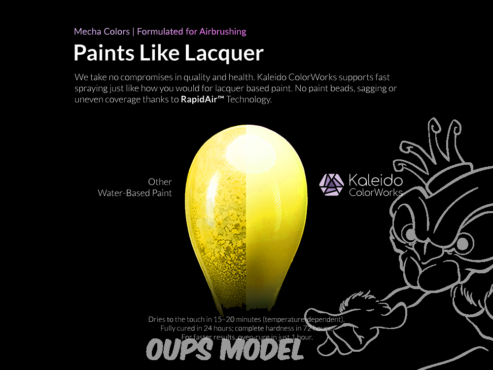 La gamme RapidAir™ de Kaleido Colorworks est une peinture acrylique haut de gamme, conçue pour une application à l'aérographe lisse et performante. Sa formule écologique, non toxique et sans solvant est pré-diluée en usine pour une utilisation directe ou une dilution facile. Grâce à la technologie RapidAir™ , elle résout les problèmes courants des peintures à l'eau, tels que les coulures, la couverture irrégulière et les bavures, en s'appliquant en une couche lisse et uniforme. Cette formule avancée offre une forte adhérence, une résistance aux rayures, une durabilité et un fini brillant comparable aux peintures à base de solvant. Sans apprêt, elle adhère à l'ABS, au PE, au PC, à la résine, au verre, au tissu, au métal et bien plus encore. Idéale pour le modélisme, les loisirs créatifs, le bricolage et un usage professionnel.