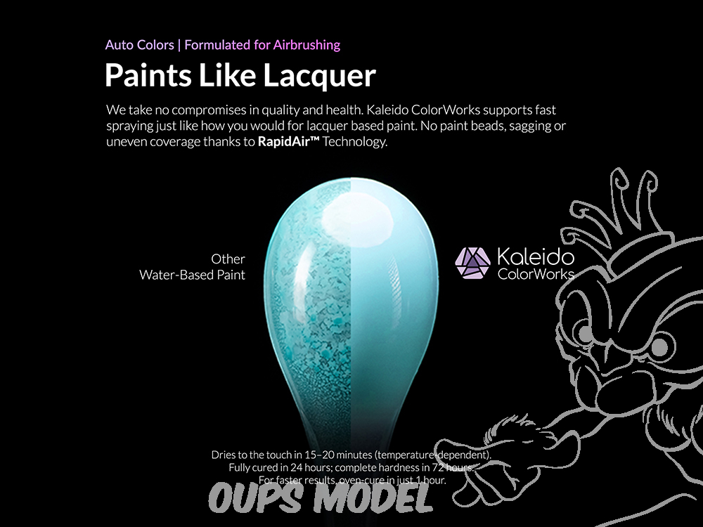 La gamme RapidAir™ de Kaleido Colorworks est une peinture acrylique haut de gamme, conçue pour une application à l'aérographe lisse et performante. Sa formule écologique, non toxique et sans solvant est pré-diluée en usine pour une utilisation directe ou une dilution facile. Grâce à la technologie RapidAir™ , elle résout les problèmes courants des peintures à l'eau, tels que les coulures, la couverture irrégulière et les bavures, en s'appliquant en une couche lisse et uniforme. Cette formule avancée offre une forte adhérence, une résistance aux rayures, une durabilité et un fini brillant comparable aux peintures à base de solvant. Sans apprêt, elle adhère à l'ABS, au PE, au PC, à la résine, au verre, au tissu, au métal et bien plus encore. Idéale pour le modélisme, les loisirs créatifs, le bricolage et un usage professionnel.