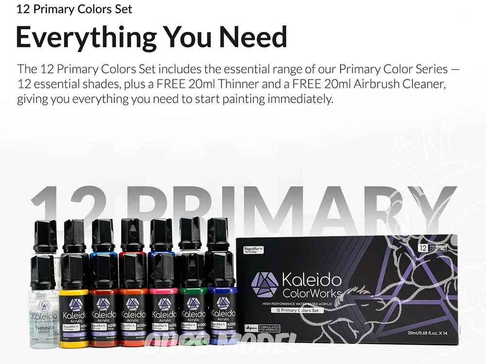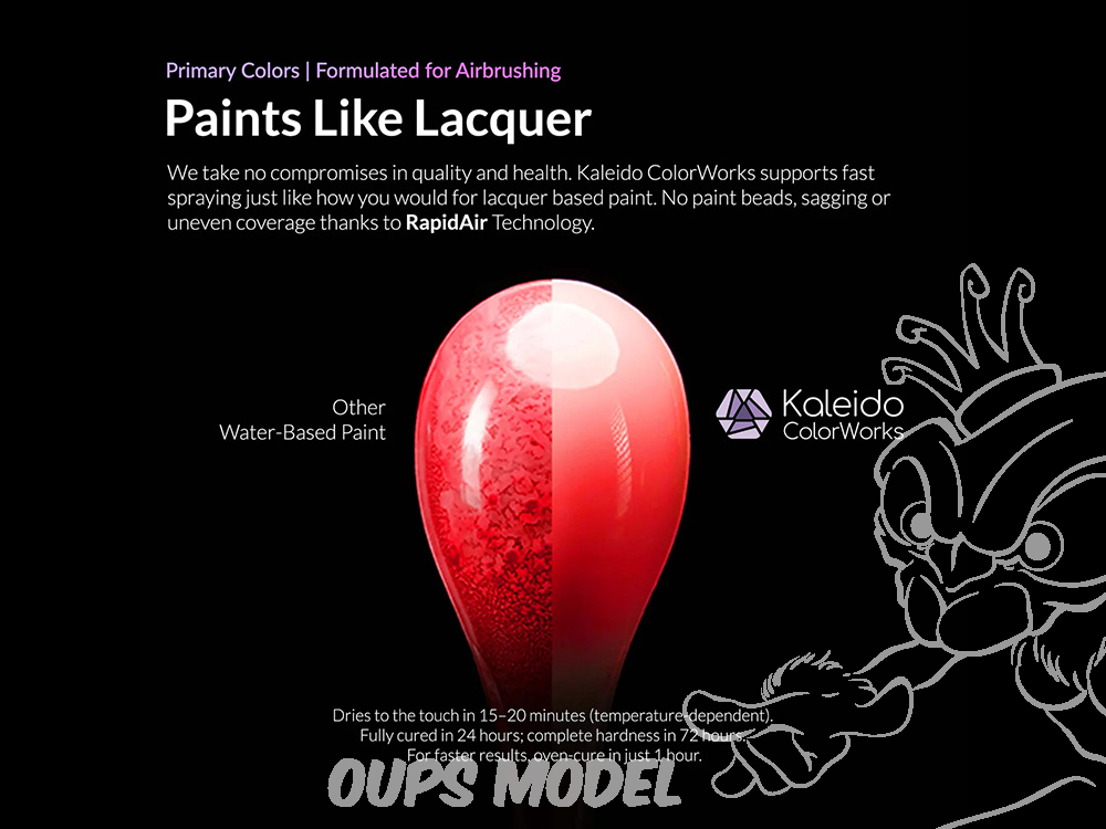 - Les peintures Kaleido sont des acryliques à base d'eau pré-diluées, prêtes à l'emploi directement du flacon avec des aérographes de 0,3 à 0,5 mm.