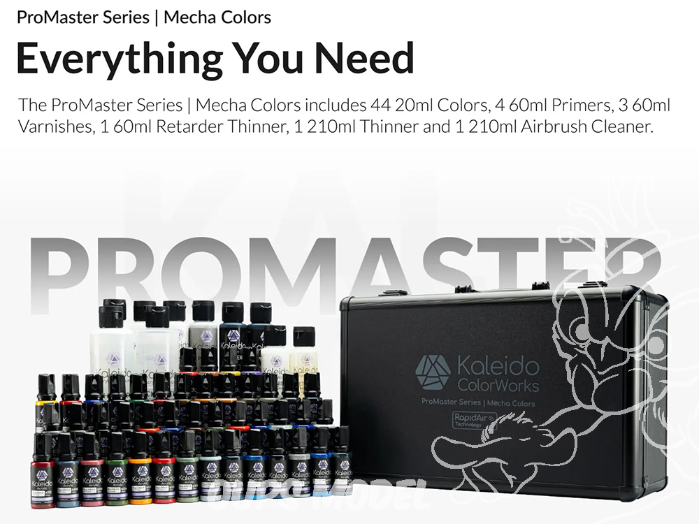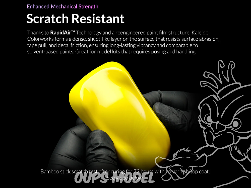 La gamme RapidAir™ de Kaleido Colorworks est une peinture acrylique haut de gamme, conçue pour une application à l'aérographe lisse et performante. Sa formule écologique, non toxique et sans solvant est pré-diluée en usine pour une utilisation directe ou une dilution facile. Grâce à la technologie RapidAir™ , elle résout les problèmes courants des peintures à l'eau, tels que les coulures, la couverture irrégulière et les bavures, en s'appliquant en une couche lisse et uniforme. Cette formule avancée offre une forte adhérence, une résistance aux rayures, une durabilité et un fini brillant comparable aux peintures à base de solvant. Sans apprêt, elle adhère à l'ABS, au PE, au PC, à la résine, au verre, au tissu, au métal et bien plus encore. Idéale pour le modélisme, les loisirs créatifs, le bricolage et un usage professionnel.