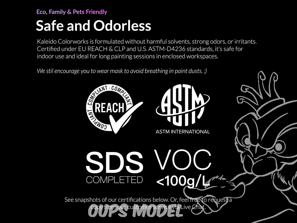 Sûr et inodore : Certifié sûr et écologique, sans solvants nocifs ni odeurs. Entièrement conforme aux normes de sécurité européennes et américaines, idéal pour une utilisation en intérieur.