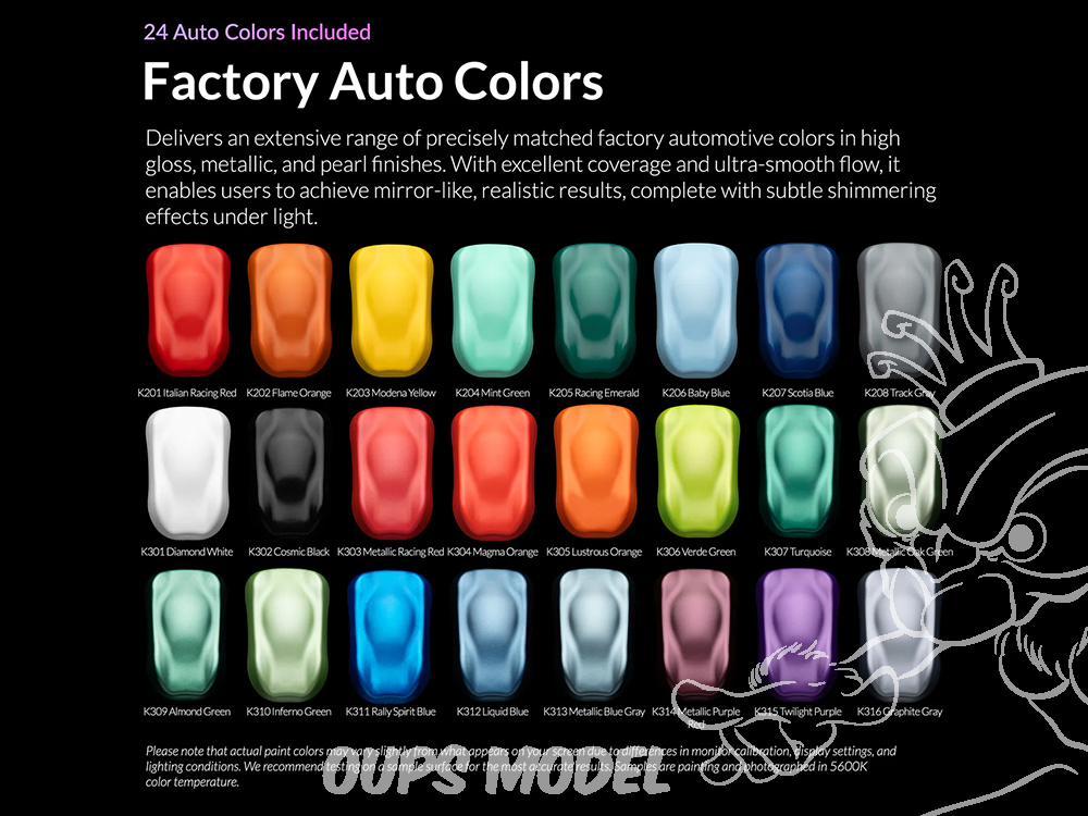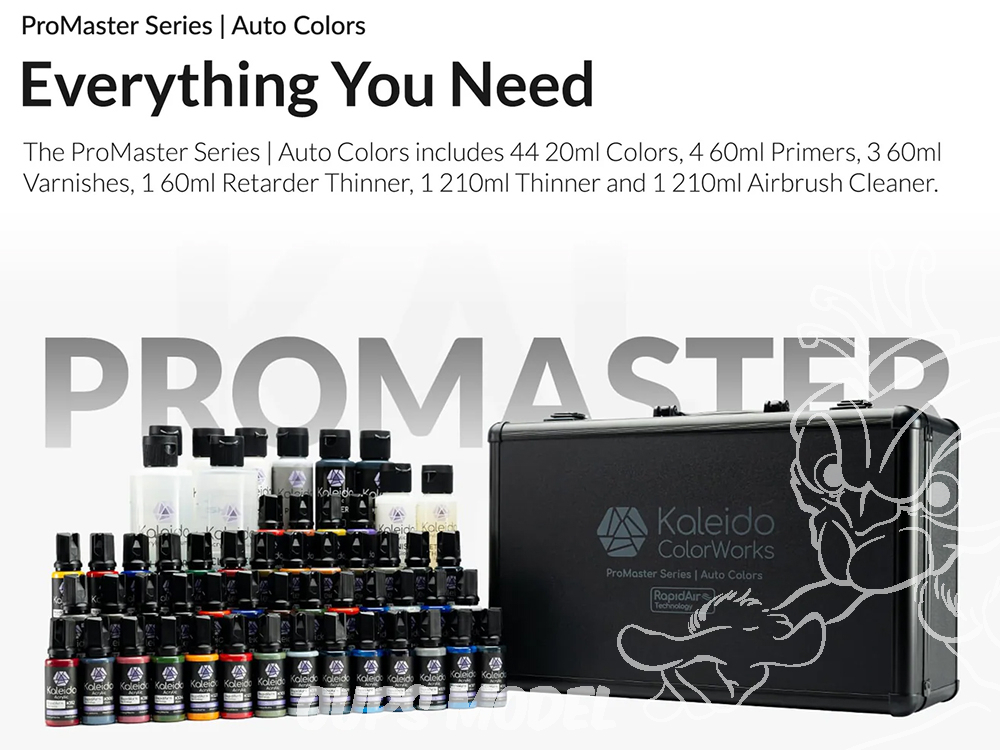Ce set comprends 24 couleurs Auto 20ml, 8 couleurs primaires 20ml, 12 couleurs métallisées 20ml, 4 apprêts 60ml, 3 vernis 60ml, 1 diluant avec retardateur 210ml, 1 diluant 60ml, 1 nettoyant 210ml.