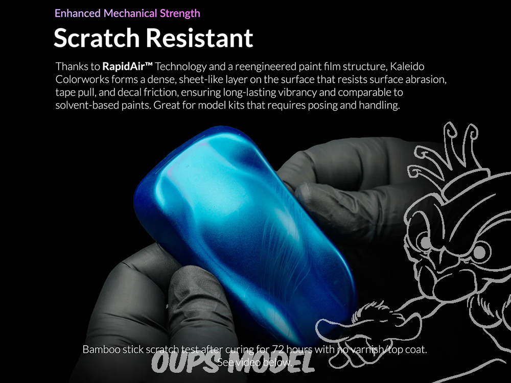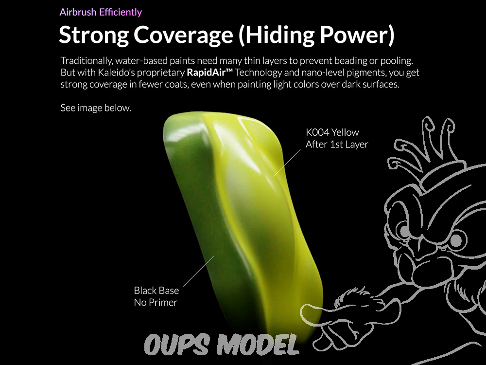 La gamme RapidAir™ de Kaleido Colorworks est une peinture acrylique haut de gamme, conçue pour une application à l'aérographe lisse et performante. Sa formule écologique, non toxique et sans solvant est pré-diluée en usine pour une utilisation directe ou une dilution facile. Grâce à la technologie RapidAir™ , elle résout les problèmes courants des peintures à l'eau, tels que les coulures, la couverture irrégulière et les bavures, en s'appliquant en une couche lisse et uniforme. Cette formule avancée offre une forte adhérence, une résistance aux rayures, une durabilité et un fini brillant comparable aux peintures à base de solvant. Sans apprêt, elle adhère à l'ABS, au PE, au PC, à la résine, au verre, au tissu, au métal et bien plus encore. Idéale pour le modélisme, les loisirs créatifs, le bricolage et un usage professionnel.