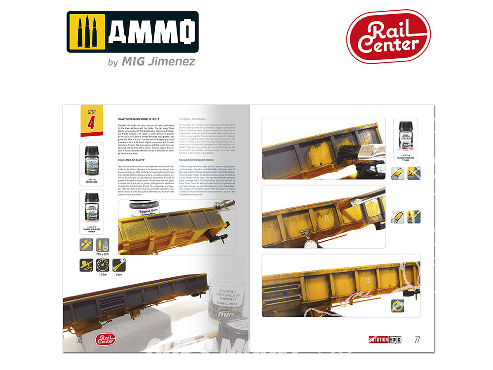 La nouvelle conception de ce guide pratique vous permettra de suivre chaque étape de manière simple et intuitive, sans texte, grâce à un système d'icônes simples qui vous indiquent la marche à suivre. En suivant les étapes de ce guide, vous obtiendrez d'excellents résultats avec un minimum d'effort. Les maquettes à l'échelle 1/87 présentées dans ce guide sont issues des marques les plus courantes. Ce guide propose également des solutions pour la peinture et le traitement des effets de vieillissement sur des maquettes à plus grande échelle, comme les kits proposés par des marques telles que Trumpeter ou Hobby Boss aux échelles 1/72 ou 1/35.