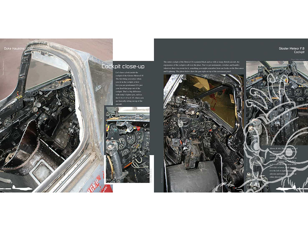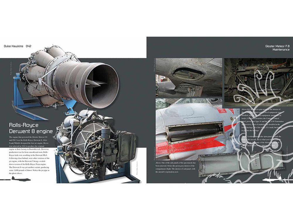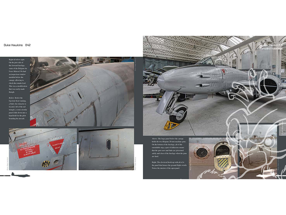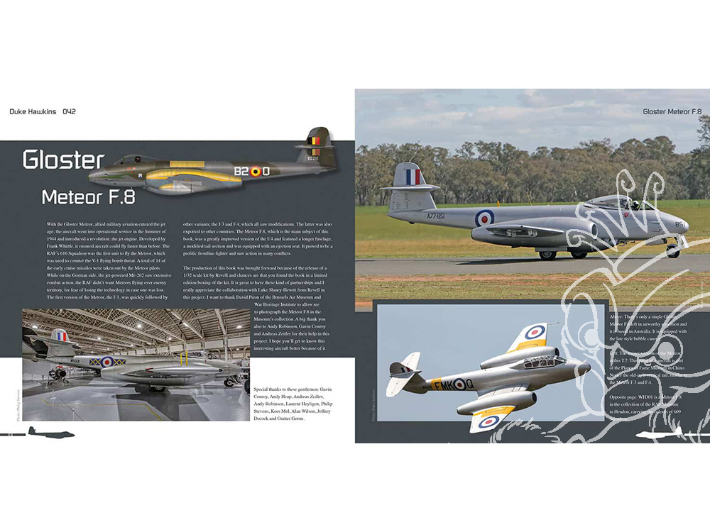 Ce livre de 84 pages dresse un portrait complet du chasseur britannique de première génération, le Gloster Meteor F.8, et de sa version de reconnaissance, le FR.9. Cet appareil, dont les origines remontent à 1943, fut mis en service après la Seconde Guerre mondiale et utilisé par de nombreuses forces aériennes, telles que la Royal Air Force (RAF), la Force aérienne belge et la Force aérienne royale néerlandaise, pour n'en citer que quelques-unes. L'ouvrage comprend des photos détaillées de l'avion, ainsi que des clichés en action du seul Meteor F.8 en état de vol au monde, situé en Australie.