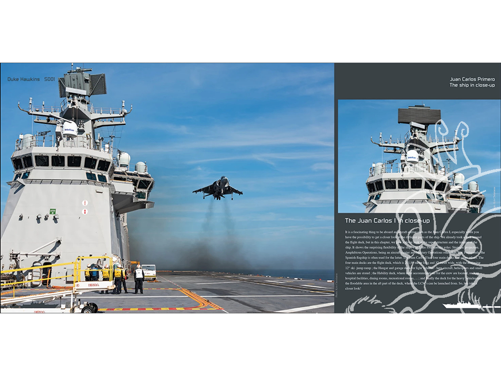 Kris Christiaens et Gert Trachez ont pu rester à bord et sont revenus avec un nombre impressionnant de photos de Harriers, d'hélicoptères, de bateaux de débarquement et plus encore. Ce livre est rempli d'action, mais nous vous donnons également un aperçu du navire lui-même: le pont d'envol, le pont du hangar, les logements et le grand pont inférieur avec la zone arrière inondable, où jusqu'à 4 péniches de débarquement peuvent être amarrées . Nous vous présentons l'équipage du navire, mais les stars du livre sont l'EAV-8B Matador II, le nom que les Harriers ont reçu de la marine espagnole.