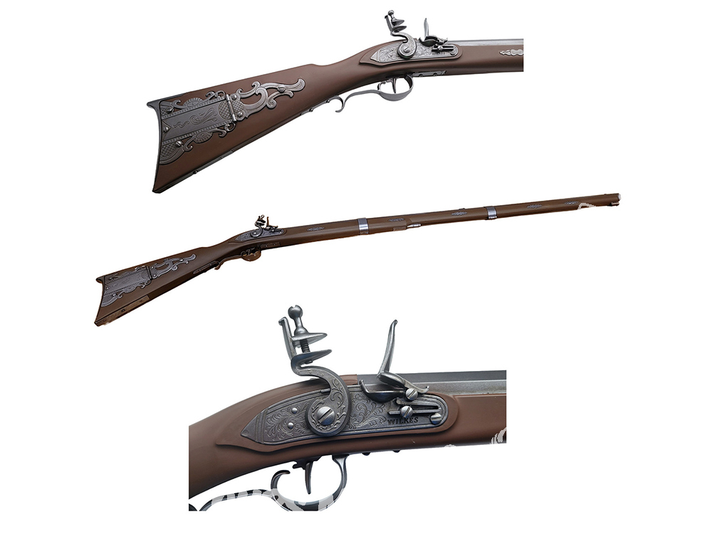 Votre maquette de carabine longue du Kentucky est une réplique authentique d'un des fusils fabriqués dans les années 1730 par des armuriers allemands et suisses près de Lancaster, en Pennsylvanie. Véritable produit américain, certains de ces fusils étaient fabriqués avec des canons mesurant jusqu'à 142 à 147 cm de long et étaient dotés de bois indigène de Pennsylvanie, principalement de l'érable, pour les crosses. Ces crosses, de longueur standard, soutenaient le canon jusqu'à son extrémité, assurant ainsi une arme stable, bien équilibrée et précise. Le fusil du Kentucky était dérivé du fusil Jäger allemand, avec quelques caractéristiques des fusils de chasse britanniques. Les armuriers ajoutèrent des rayures au canon, imprimant une rotation à la balle et améliorant considérablement la précision à longue distance, dépassant parfois les 200 mètres. Ce fusil devint un outil de survie essentiel pour la chasse et la défense personnelle dans l'Ouest américain. Il joua également un rôle important lors de la guerre d'Indépendance et de la guerre de 1812, bien qu'il ne fût pas une arme réglementaire. Le fusil doit son nom à son utilisation répandue parmi les pionniers du Kentucky, et à une chanson patriotique populaire de l'époque, « Hunters of Kentucky », célébrant la victoire d'Andrew Jackson à la bataille de La Nouvelle-Orléans. Le fusil long fut utilisé par des pionniers célèbres tels que Davy Crockett, Daniel Boone et Lewis et Clark. Son usage se répandit largement jusqu'au milieu du XIXe siècle.