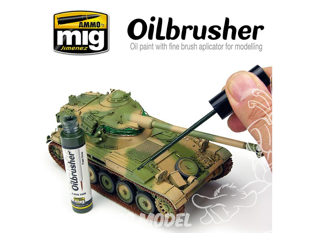 Oilbrusher contient de la peinture à l'huile de haute qualité spécialement formulé pour le maquettisme, dilué à la consistance parfaite pour être utilisé directement à la sortie du pot. Le bouchon a un pinceau de haute précision intégré pour appliquer directement sur le modèle, sans avoir à mettre la peinture à l'huile sur une palette. Cette évolution empêche l'huile de sécher et de gaspiller inutilement le produit. En outre, le pot comprend un système distributeur-nettoyant qui enlève l'excédent de peinture du pinceau, en laissant juste la bonne quantité sur la pointe. Les tubes traditionnels de peinture à l'huile étaient salissant à utiliser et difficile à ouvrir lorsque la peinture à l'huile séchait autour du bouchon jusqu'à le coincer.