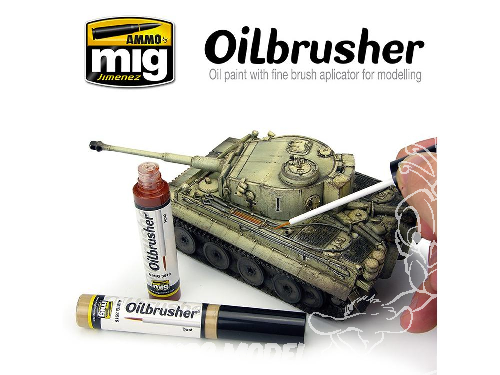 Oilbrusher contient de la peinture à l'huile de haute qualité spécialement formulé pour le maquettisme, dilué à la consistance parfaite pour être utilisé directement à la sortie du pot. Le bouchon a un pinceau de haute précision intégré pour appliquer directement sur le modèle, sans avoir à mettre la peinture à l'huile sur une palette. Cette évolution empêche l'huile de sécher et de gaspiller inutilement le produit. En outre, le pot comprend un système distributeur-nettoyant qui enlève l'excédent de peinture du pinceau, en laissant juste la bonne quantité sur la pointe. Les tubes traditionnels de peinture à l'huile étaient salissant à utiliser et difficile à ouvrir lorsque la peinture à l'huile séchait autour du bouchon jusqu'à le coincer.