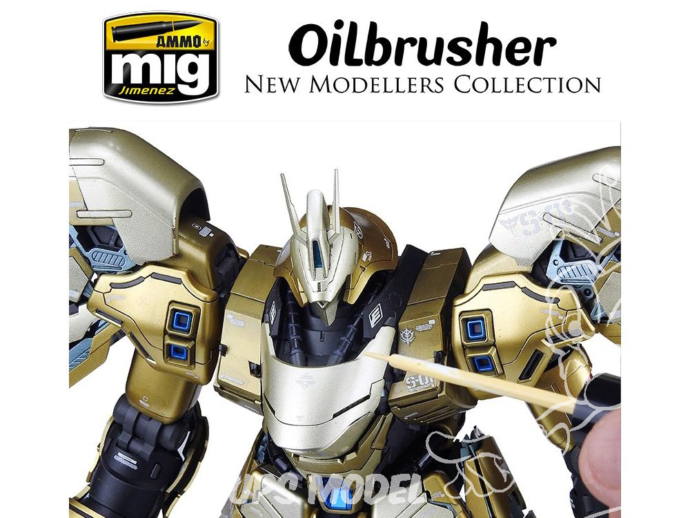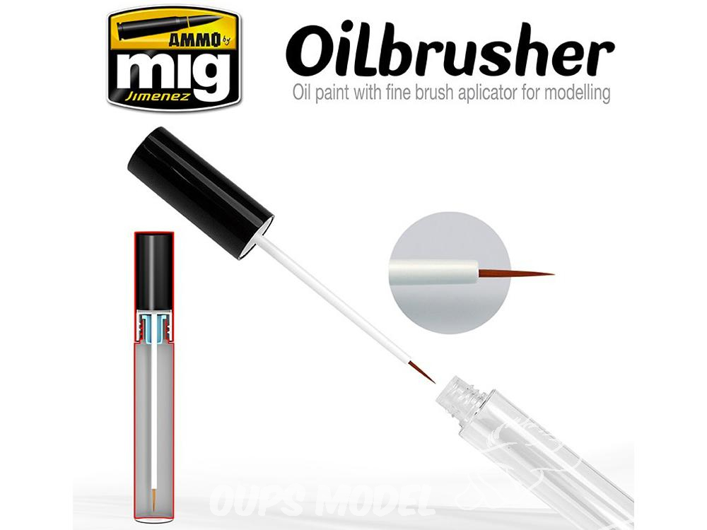 Oilbrusher contient de la peinture à l'huile de haute qualité spécialement formulé pour le maquettisme, dilué à la consistance parfaite pour être utilisé directement à la sortie du pot. Le bouchon a un pinceau de haute précision intégré pour appliquer directement sur le modèle, sans avoir à mettre la peinture à l'huile sur une palette. Cette évolution empêche l'huile de sécher et de gaspiller inutilement le produit. En outre, le pot comprend un système distributeur-nettoyant qui enlève l'excédent de peinture du pinceau, en laissant juste la bonne quantité sur la pointe. Les tubes traditionnels de peinture à l'huile étaient salissant à utiliser et difficile à ouvrir lorsque la peinture à l'huile séchait autour du bouchon jusqu'à le coincer.