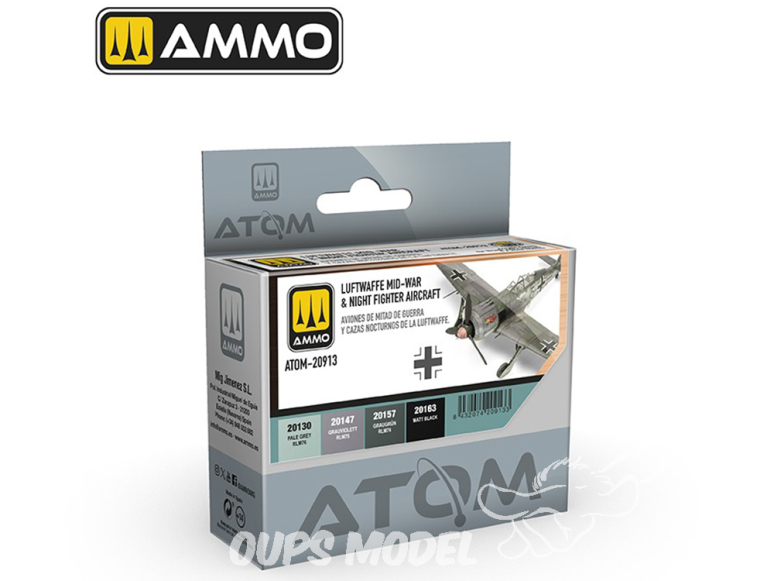 Contient 4 couleurs de peintures acryliques de haute qualité spécialement conçues pour représenter le camouflage utilisé par la Luftwaffe au milieu de la Seconde Guerre mondiale, ainsi que sur les chasseurs de nuit. Avec ces couleurs, nous pouvons peindre la plupart des avions utilisés pendant cette période, des célèbres Bf 109, Bf 110 et Fw 190 aux chasseurs de nuit comme le He 219 ou le Me 410. Ce coffret résout les problèmes lors du choix des couleurs pour nos modèles, ce qui permet de gagner un temps précieux. Les nuances sont précises, mais légèrement éclaircies pour compenser l'effet d'échelle sur n'importe quel modèle.