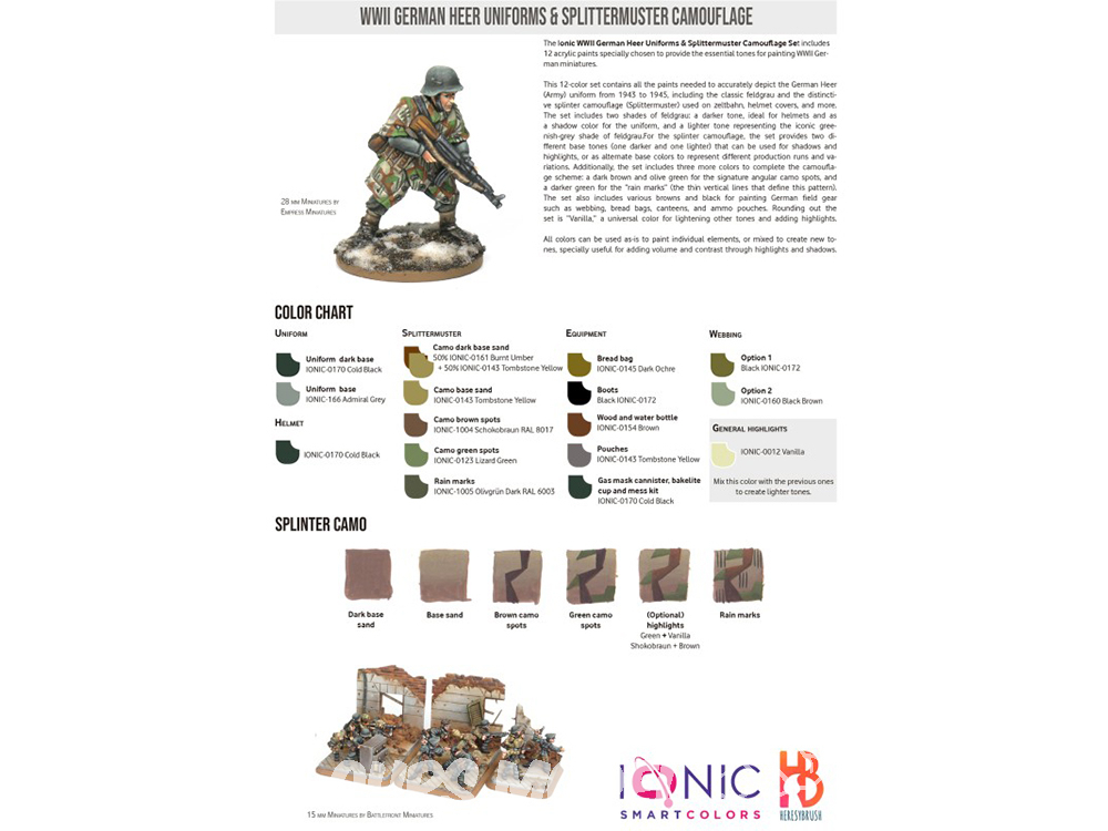 Le set Ionic Uniformes de la Heer allemande de la Seconde Guerre mondiale et camouflage à éclats comprend 12 peintures acryliques spécialement sélectionnées pour offrir les tons essentiels à la peinture de figurines allemandes de la Seconde Guerre mondiale.