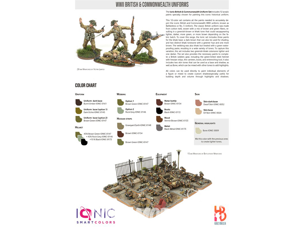 L'uniforme britannique classique était confectionné en sergé de coton, tissé avec un mélange de fibres brunes et vertes, ce qui lui donnait une teinte brun-vert ou kaki variable, plus claire, plus foncée, plus verte ou plus brune selon le lot de tissu. Pour couvrir cette palette, le coffret Ionic comprend trois peintures pour la base kaki : un brun foncé, également utilisable pour les dégradés, et deux tons kaki distincts, l'un plus vert et l'autre plus brun.