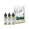 Ensemble de peintures acryliques dans des tons de vert végétation, spécialement formulées pour créer des ombres et des effets de transparence sur des zones spécifiques à l'aérographe. 3 flacons de 17 ml.