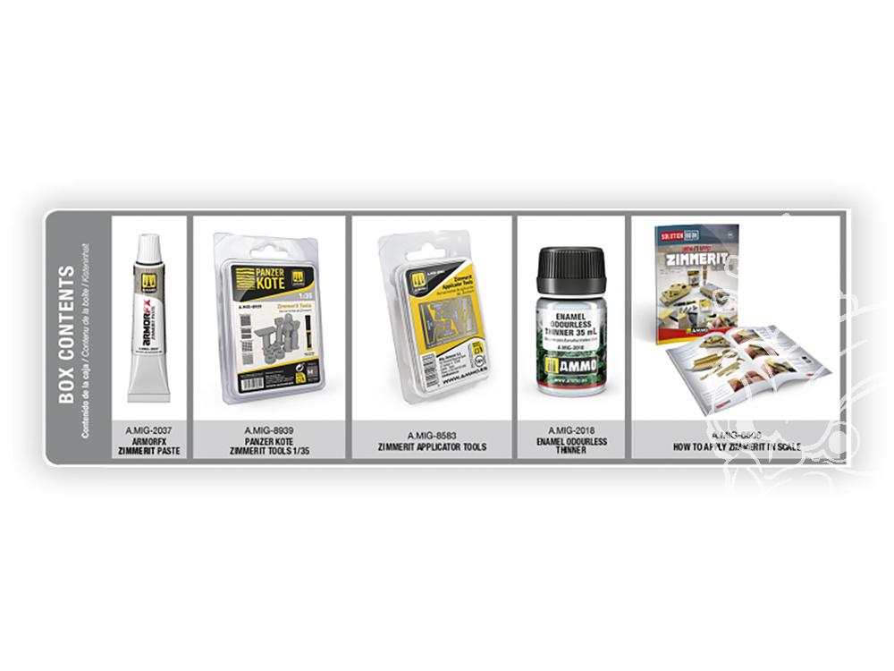 Ce Kit Solution inclut les matériaux et outils indispensables pour une application de Zimmerit parfaitement réaliste grâce à la pâte Zimmerit ArmorFX A.MIG-2037 et aux outils spécifiques AMMO : l'applicateur de Zimmerit A.MIG-8583 et l'outil Zimmerit PanzerKote 1/35 A.MIG-8939. La même méthode est applicable aux outils PanzerKote aux échelles 1/72, 1/48 et 1/16, vendus séparément.