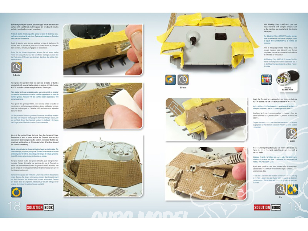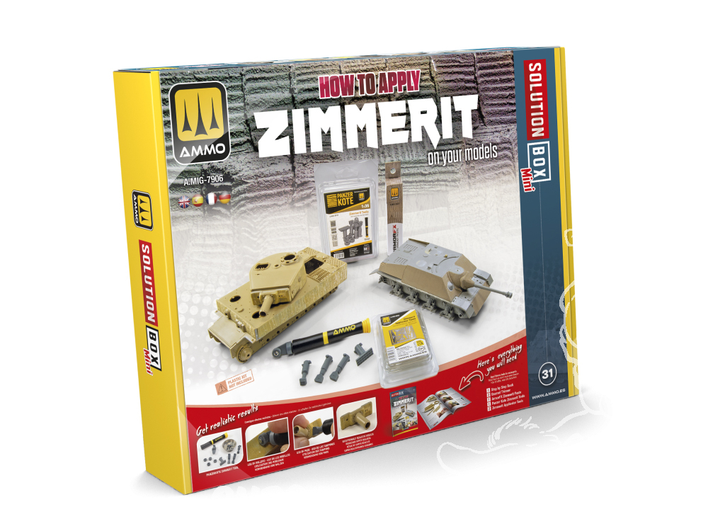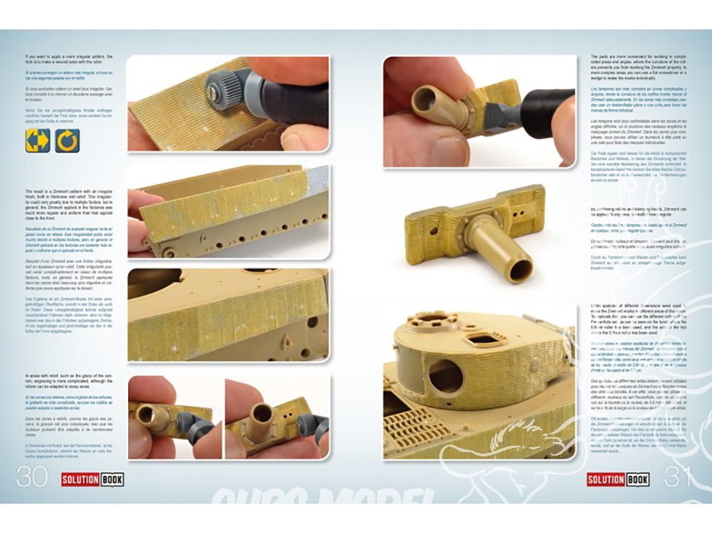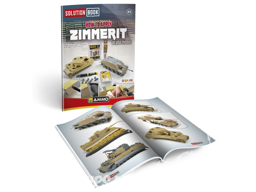 Le Kit Solution A.MIG-6606 – Guide pratique n° 31 – Application du Zimmerit à l'échelle – est également inclus. Ce guide complet de 35 pages propose des tutoriels pas à pas en quatre langues (anglais, espagnol, français et allemand). En suivant les instructions étape par étape de ce livre, vous pourrez facilement créer n'importe quel motif Zimmerit, avec l'épaisseur et la texture adéquates, pour une finition à l'échelle absolument réaliste. Vous pourrez même reproduire les ébréchures et les dommages de surface visibles sur les photos de Zimmerit authentiques.