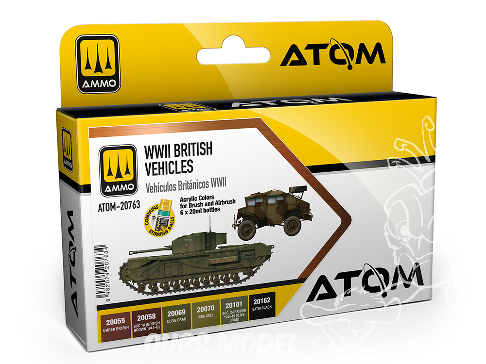 Il contient six peintures acryliques de haute qualité, spécialement formulées pour peindre les véhicules britanniques de 1939 à 1945, engagés sur le théâtre d'opérations européen. Du Matilda Mk I au Sherman Firefly de fin de guerre, en passant par de nombreux autres véhicules blindés et véhicules non blindés, ce coffret est idéal.