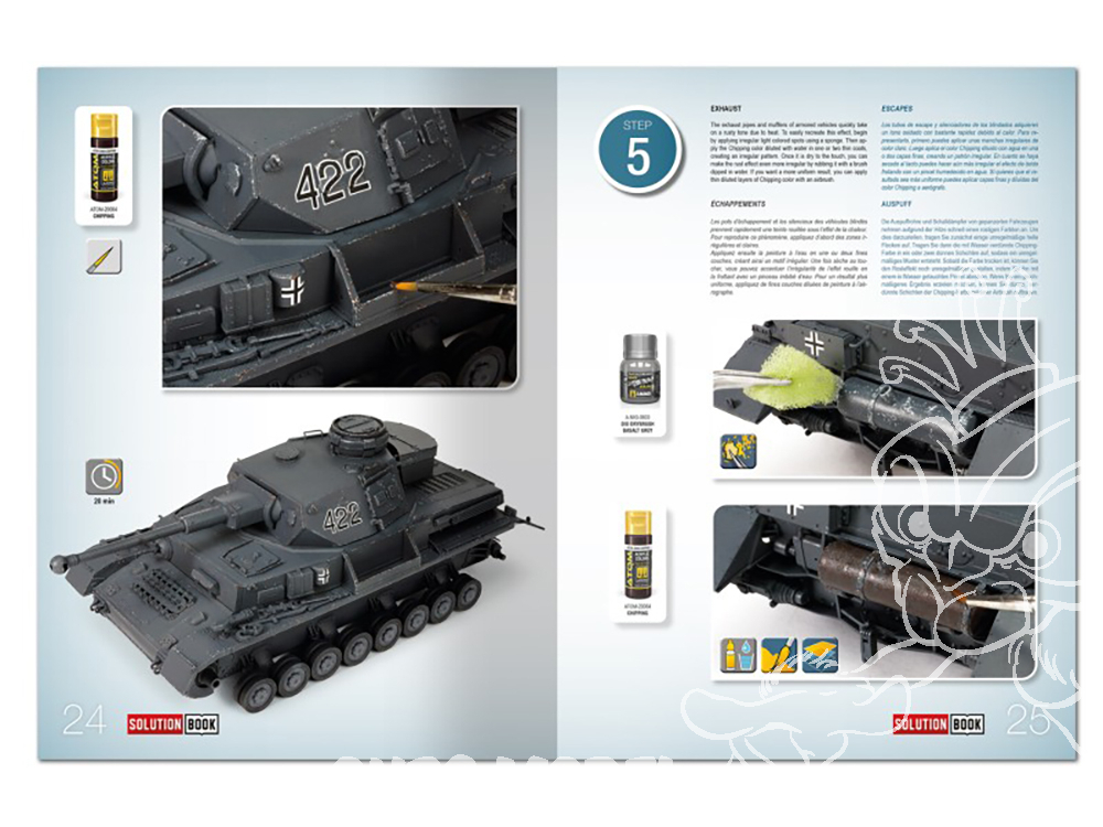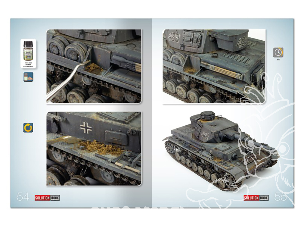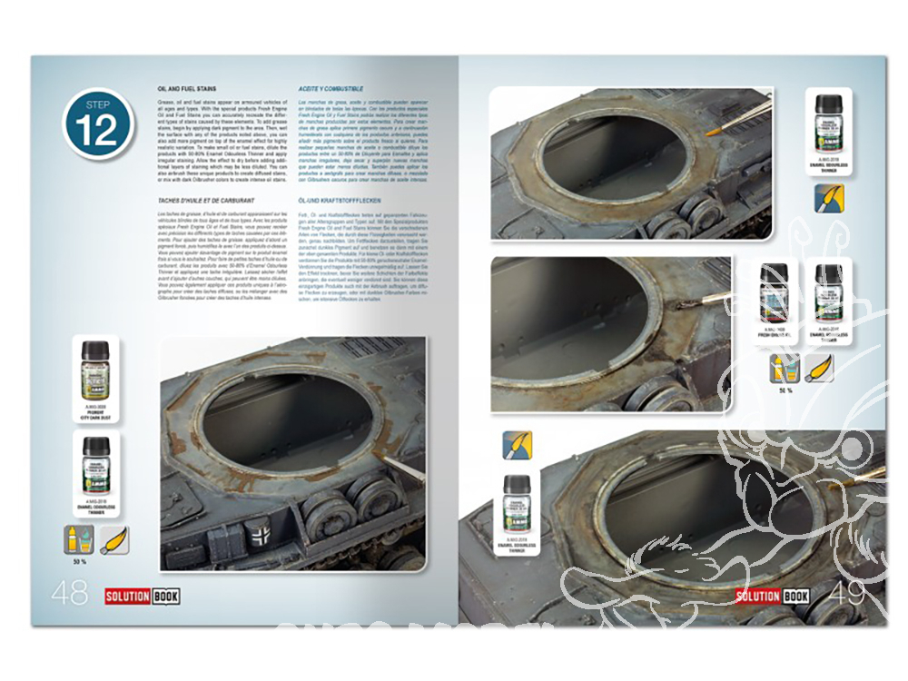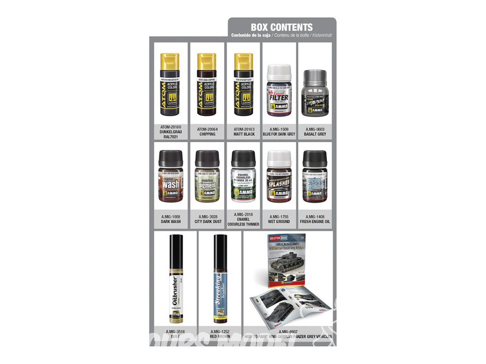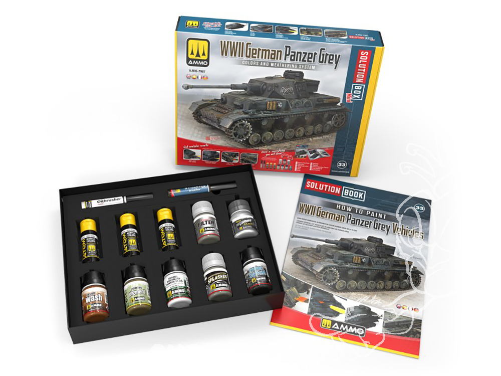 Cette SOLUTION BOX MINI vous fournit non seulement les peintures aux teintes exactes, les produits de patine et les pinceaux nécessaires, mais inclut également la précieuse ressource A.MIG-6607 Solution Book 33 : How to Paint WWII German Dunkelgrau Vehicles, un guide complet de 63 pages avec tutoriels pas à pas en quatre langues : anglais, espagnol, français et allemand.