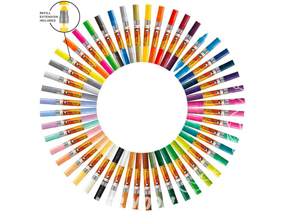 Très opaque et résistant aux UV sur presque toutes les surfaces: Le système de marqueur acrylique durable ONE4ALL ™ a été conçu pour le remplissage et est toujours fiable dans toutes ses fonctions. Une faible usure et de nombreuses applications possibles offrent une valeur ajoutée à ces marqueurs. Que vous peigniez une planche de surf, une toile, un frigo, des graffitis ou des baskets: rien n’est impossible. Le ONE4ALL ™ Acrylic Twin est disponible en 48 teintes. De plus, vous pouvez mélanger vos nuances de couleur individuelles en utilisant le marqueur vide vide et les 50 recharges ONE4ALL ™.