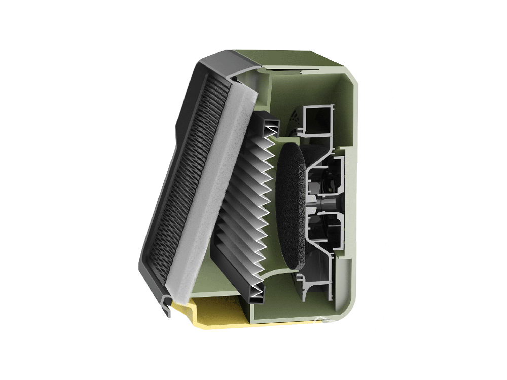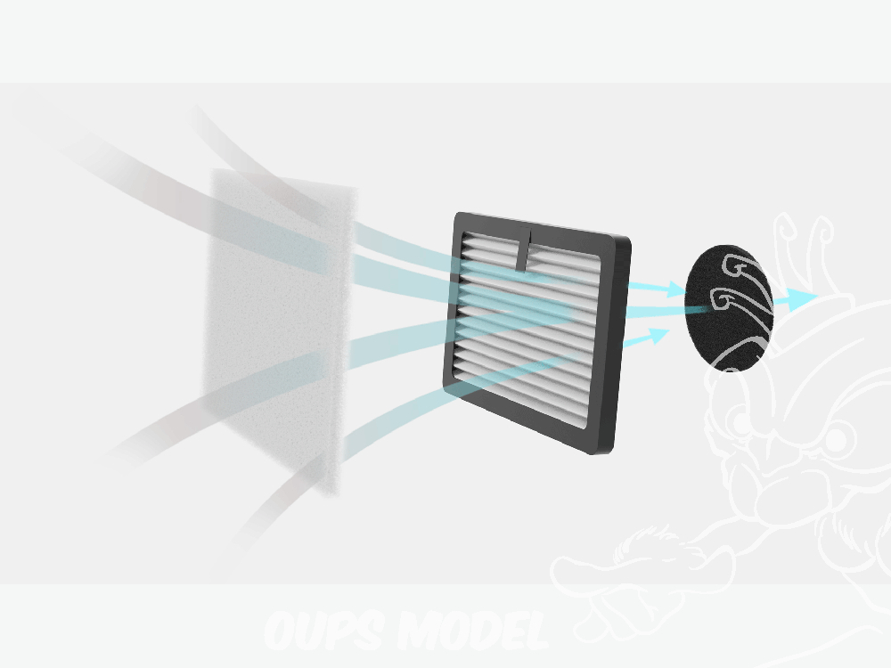 Système de filtration à trois étapes : Préfiltre pour séparer les grosses particules. Filtre principal de haute qualité de classe HEPA 13 et filtre à charbon actif. Remplacement facile du filtre.