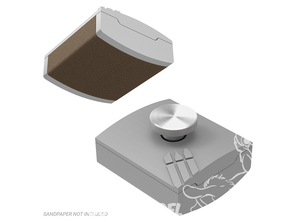 Disponible en deux versions — plane et courbe —, le support s’adapte à toutes les géométries : arêtes droites de véhicules, contours organiques de socles scéniques ou courbes marquées de casques et d’épaulières. La pince interne maintient les feuilles de papier abrasif, à l’eau ou à sec, parfaitement tendues et sans plis, quel que soit le grain.