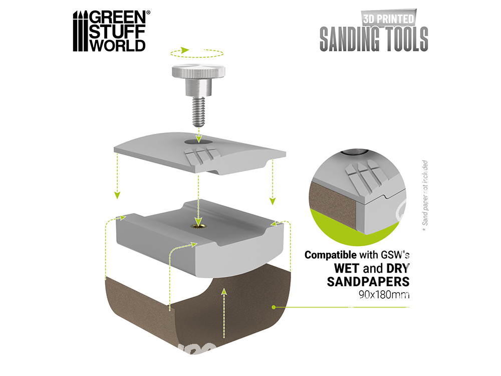 Le porte-papier abrasif manuel ou ponceuse manuelle plat Green Stuff World est un outil à la fois robuste et léger, imprimé en PLA haute résistance, qui offre la solution idéale pour obtenir des surfaces impeccables en modélisme, wargames, maquettes et cosplay. Sa conception ergonomique assure une prise en main confortable et précise, permettant aussi bien le dégrossissage que le polissage fin de figurines, pièces imprimées en 3-D ou armures en mousse EVA.