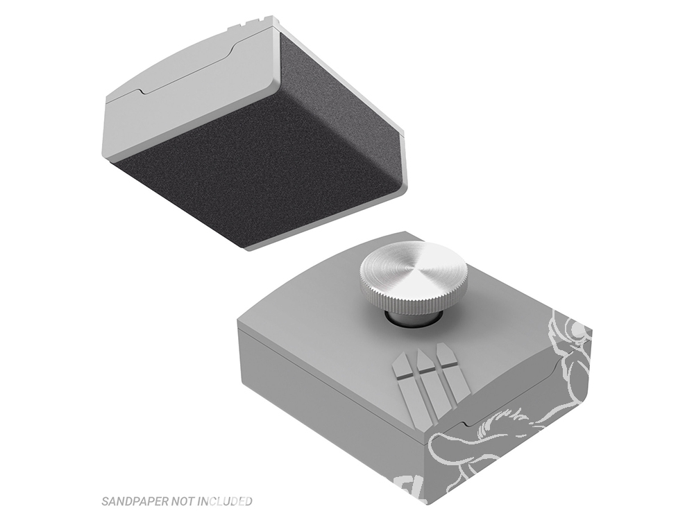Disponible en deux versions — plane et courbe —, le support s’adapte à toutes les géométries : arêtes droites de véhicules, contours organiques de socles scéniques ou courbes marquées de casques et d’épaulières. La pince interne maintient les feuilles de papier abrasif, à l’eau ou à sec, parfaitement tendues et sans plis, quel que soit le grain.
