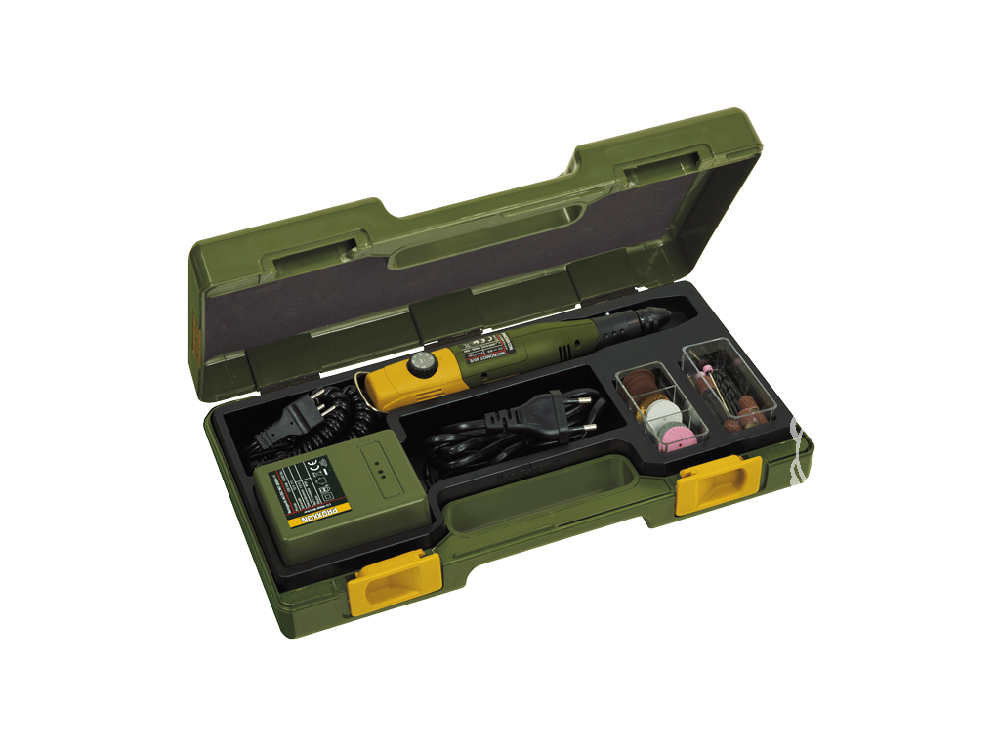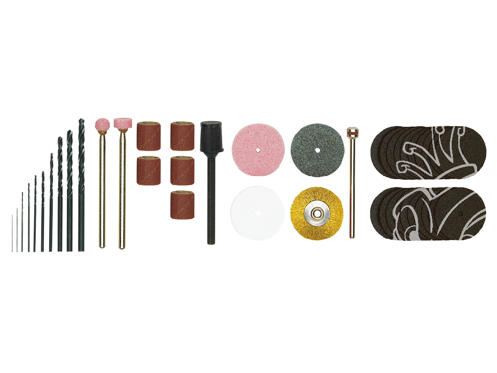 10 forets HSS, similaire à DIN 338. Ø 0,3 – 0,5 – 0,8 – 1 – 1,2 – 1,5 – 2 – 2,5 – 3 – 3,2, 1 meule sur tige ronde, 1 meule sur tige cylindrique, 5 petit rouleau de rectification, 1 support pour petit rouleau de rectification, 1 disque de ponçage Ø 22 mm (couleurs pink) en corindon précieux, 1 disque de ponçage Ø 22 mm (gris) en carbure de silicium, 1 disque de polissage pour altuglas et plexiglas, 1 brosse en laiton, 20 disques à tronçonner en corindon, 1 porte-outil. Avec transformateur pour branchement sur 230 V (12 V, 1 A).
