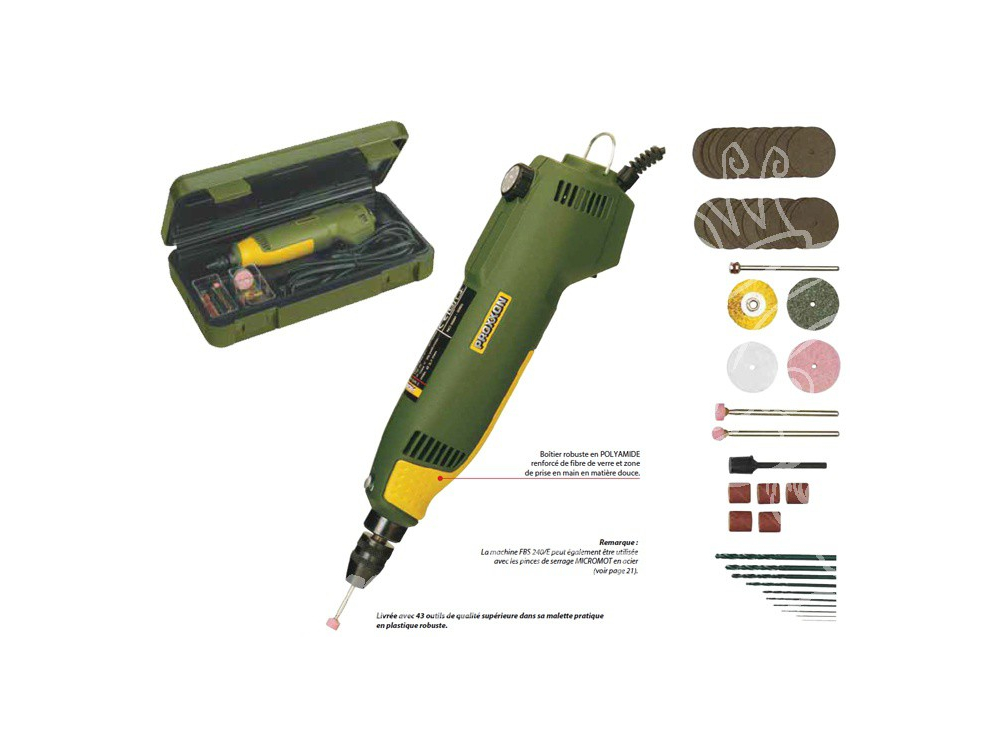 Meuleuse perceuse de precision FBS 240/E. Un outil polyvalent pour le travail délicat. Précis et silencieux. Complète avec 43 outils de qualité supérieure.