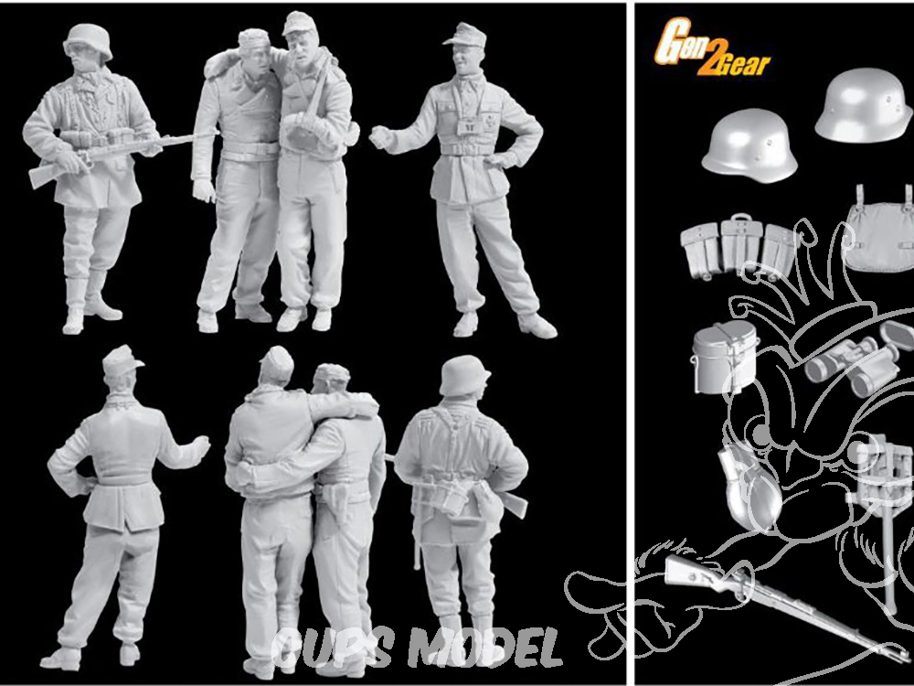 Le dernier coffret de figurines à l'échelle 1/35 de Dragon représente quatre soldats allemands participant à la bataille d'Arnhem. Sculptées avec précision et netteté par le célèbre sculpteur japonais Hirano Yoshitaka pour un réalisme saisissant, ces quatre figurines forment une scène de guerre dès l'ouverture de la boîte. Deux tankistes blessés ont survécu à la destruction de leur char par des parachutistes britanniques et s'entraident pour rejoindre un centre de soins. Ces figurines bandées sont conçues pour s'assembler en une paire dans cette pose réaliste. Elles sont soutenues par deux panzergrenadiers d'une des unités envoyées à Arnhem pour stopper l'avancée britannique. Ces figurines sont d'une grande qualité, tant au niveau de la pose que des proportions et des détails ; un soldat offre même une cigarette aux tankistes blessés. Bien que ces quatre figurines soient idéales pour une scène des combats acharnés d'Arnhem, leur polyvalence leur permet également d'être utilisées dans d'autres contextes ou sur d'autres théâtres d'opérations, si le maquettiste le souhaite.