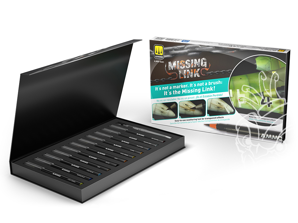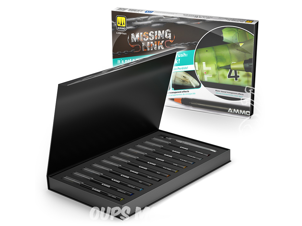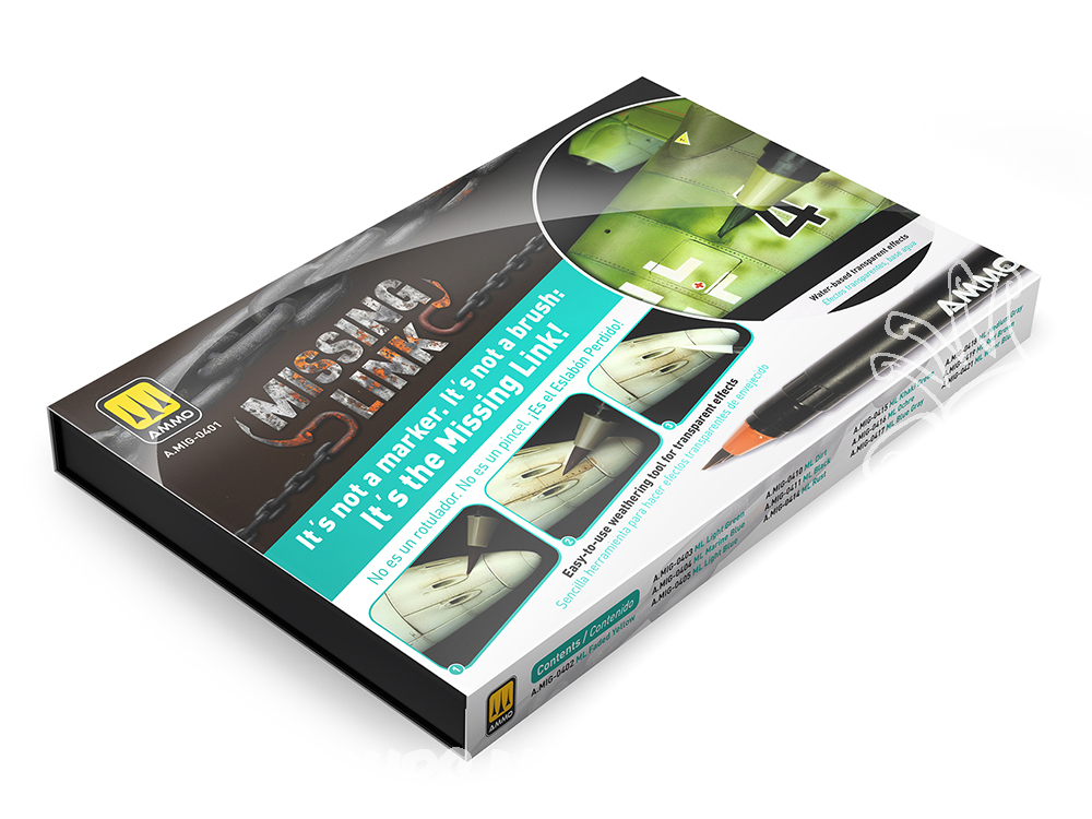 Le nouveau coffret de marqueurs aquarelle à pointe pinceau d'AMMO by MIG Jimenez représente une évolution dans les outils de maquettisme. Conçu pour la précision, la polyvalence et la facilité d'utilisation, ce set de 12 couleurs transparentes a été soigneusement sélectionné pour reproduire des effets réalistes sur les maquettes de véhicules militaires. Avec les marqueurs Missing Link à pointe pinceau, vous pouvez appliquer une multitude d'effets, des filtres aux vieillissements, sur vos modèles.
