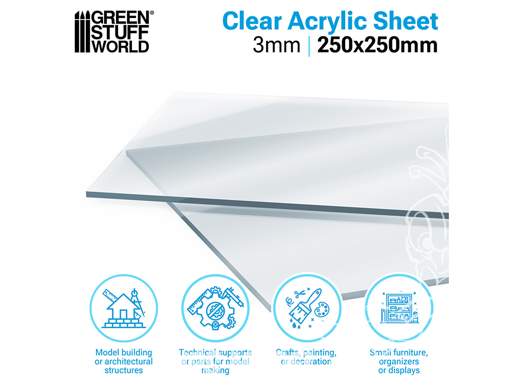 Disponibles en différentes tailles et formes, ces plaques acryliques s'adaptent à des projets de toute envergure : des petites créations artisanales aux grands décors et maquettes architecturales. Elles sont particulièrement utiles pour concevoir des socles transparents pour miniatures, où le socle ne détourne pas l'attention du spectateur et s'intègre parfaitement à l'environnement dans lequel il est placé. Leur transparence permet même de jouer avec l'éclairage à l'aide de LED placées sous ou derrière les pièces, pour obtenir des effets uniques dans les dioramas futuristes, les maquettes de science-fiction ou les décors fantastiques.