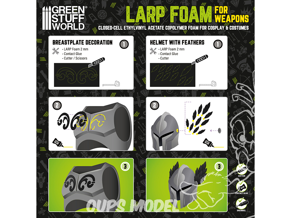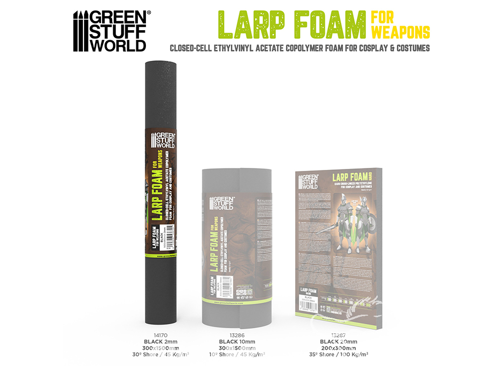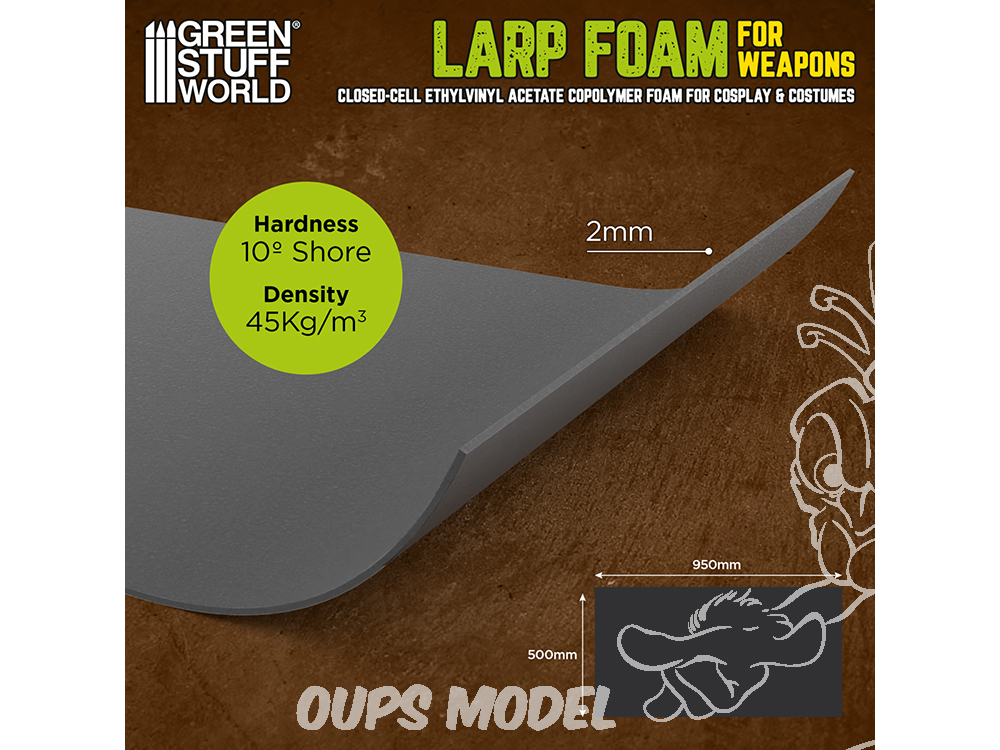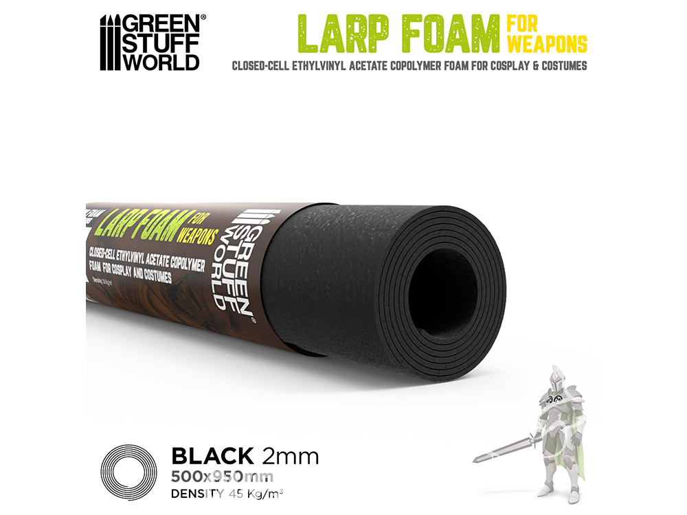 Dans notre boutique cosplay, vous trouverez de la mousse LARP souple en copolymère d'éthylène-vinyle-acétate à cellules fermées de 45 kg/m3, largement utilisée dans le monde du cosplay et de l'artisanat comme matériau de construction d'armes softcombat et LARP, valable aussi bien pour créer des éléments décoratifs et fonctionnels souples qui peuvent à un moment donné frapper votre partenaire dans un jeu de rôle en direct, comme par exemple la lame d'un sabre, comme éléments décoratifs de type filigranes ou plumes pour ailes dans leur version la plus fine de 2 mm. La légèreté et en même temps la consistance de ce matériau, proche du mousse EVA, permet de créer des structures complexes d'éléments légers.