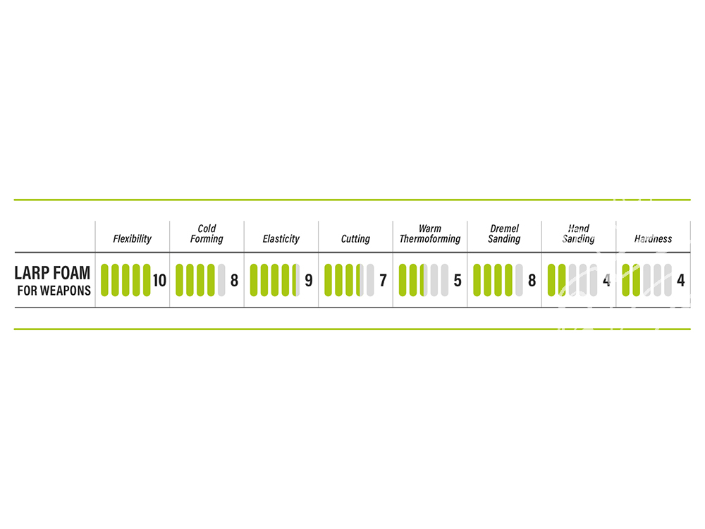 Le principal avantage de ces mousses pour armes de jeu de rôle grandeur nature dans ce contexte réside dans leur dureté et leur épaisseur, associées à leur légèreté et à leur facilité de découpe et de ponçage.