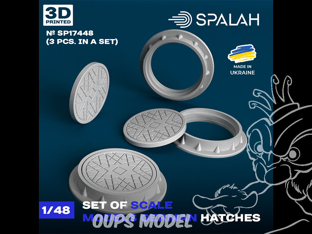 Ensemble de maquettes de plaques d'égout allemandes (3 pièces). Échelle : 1/48. Ces maquettes sont réalisées par impression 3D en résine photopolymère de haute qualité, offrant un niveau de détail exceptionnel. Supports inclus. Les plaques d'égout allemandes sont des éléments caractéristiques de l'infrastructure urbaine. Cet ensemble comprend 3 maquettes détaillées de plaques d'égout, reproduisant fidèlement les caractéristiques typiques des modèles allemands du milieu du XXe siècle. Idéal pour les collectionneurs, les maquettistes et pour la création de dioramas militaires sur le thème de la Seconde Guerre mondiale.