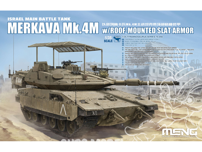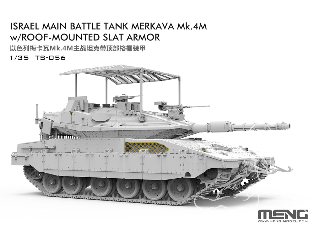 MENG lancera le char de combat principal israélien TS-056 1/35 Merkava Mk.4M avec kit de modèle d'armure à lattes montée sur le toit. Le modèle assemblé mesurera 267 mm de long, 114 mm de large et 122 mm de haut (y compris le blindage des lattes montées sur le toit). Ce kit comprend des pièces PE de précision et fournit deux schémas de peinture. Vérifions les détails.