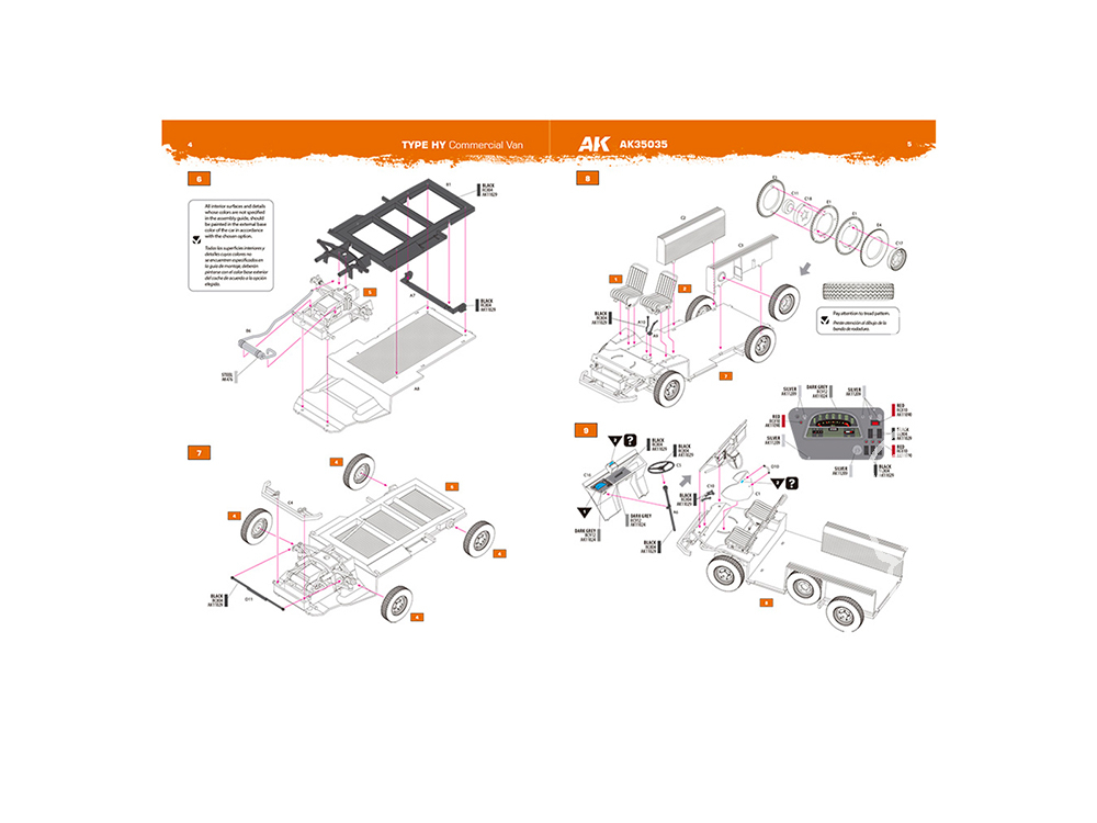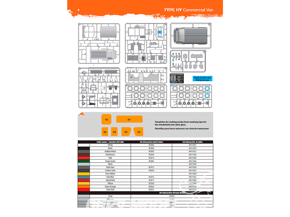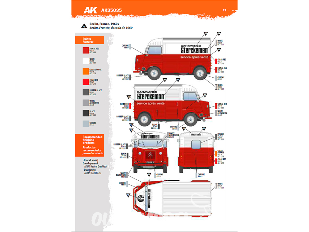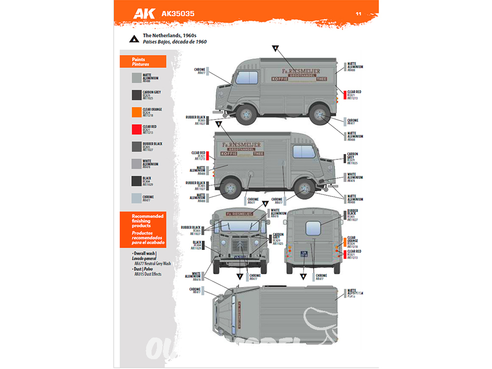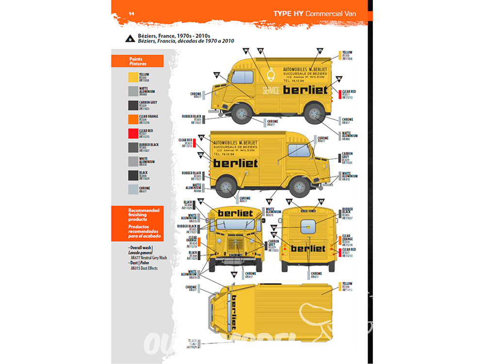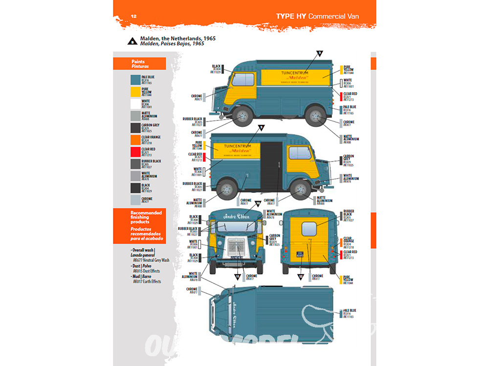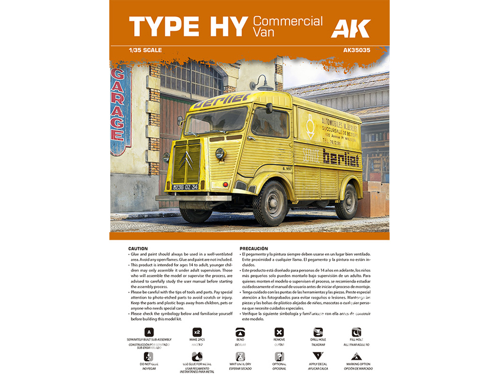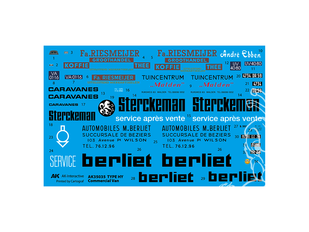 La référence AK35035 représente la fourgonnette de la série Type HY, produite du début de 1964 à la fin de 1969, avec un pare-brise unique, des chevrons courts sur la calandre, une poignée verticale sur la porte coulissante et une lunette arrière carrée. La planche de décalcomanies comprend les marquages ​​pour quatre véhicules aux couleurs différentes, utilisés par des entreprises privées françaises et néerlandaises.