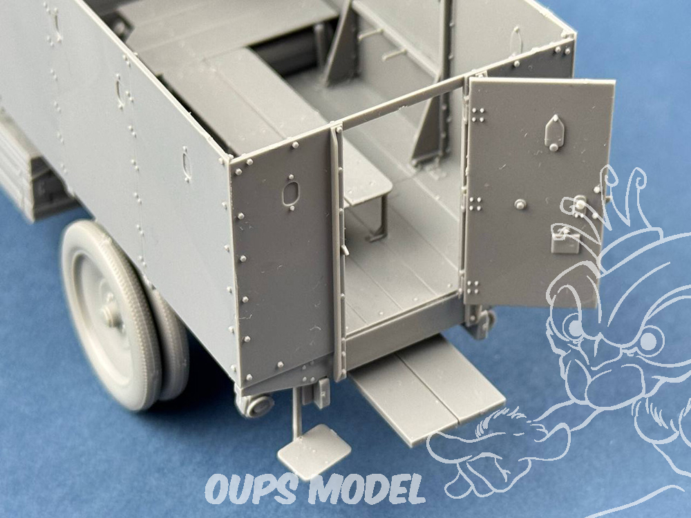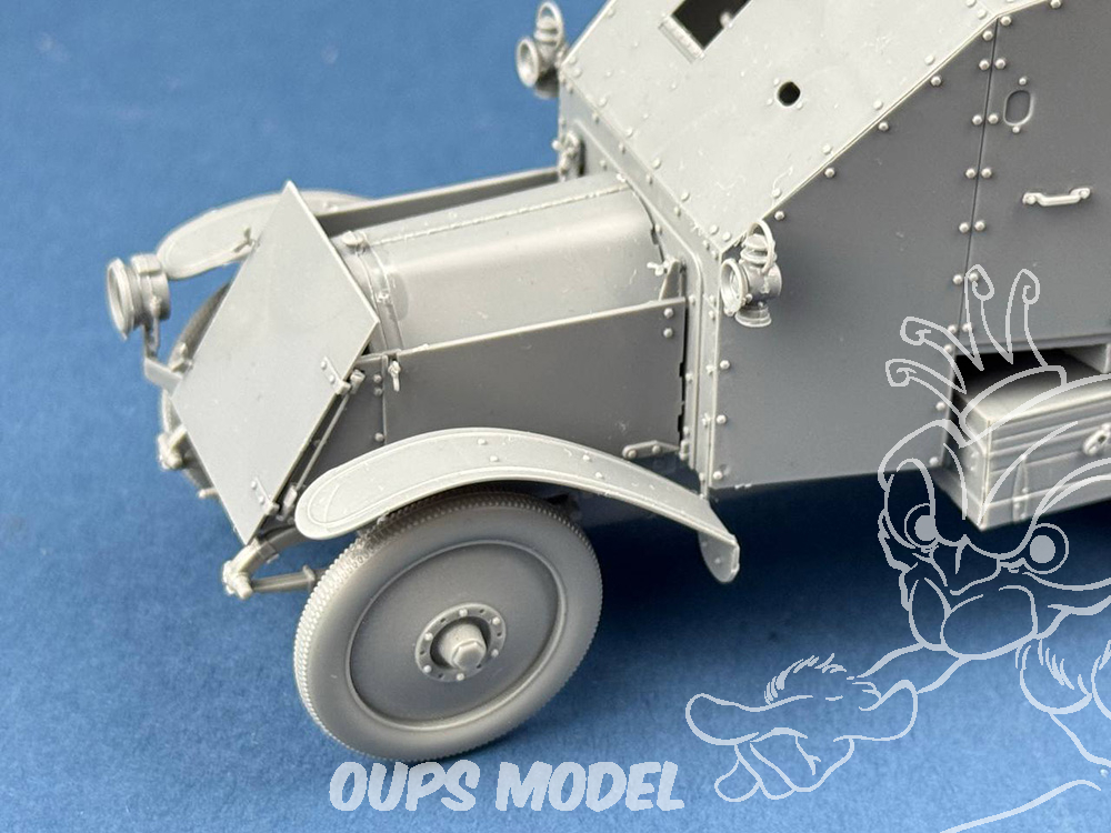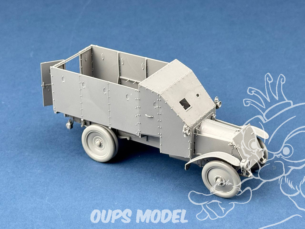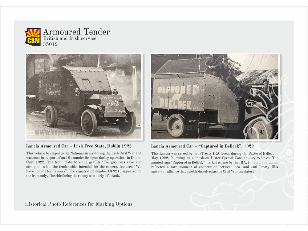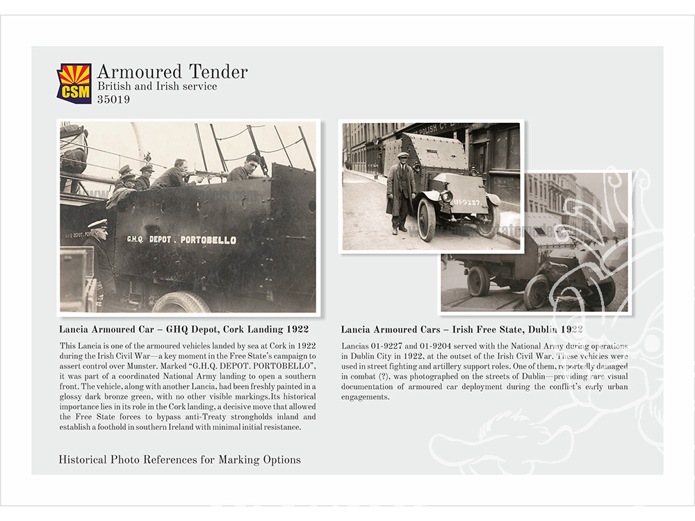 Maquette en plastique injecté très détaillée représentant le véhicule blindé de transport de troupes britannique utilisé par l'armée nationale de l'État libre d'Irlande pendant la guerre civile irlandaise. Ces véhicules furent largement employés en 1922-1923 pour l'escorte de convois, les combats urbains et l'appui d'artillerie à travers toute l'Irlande.