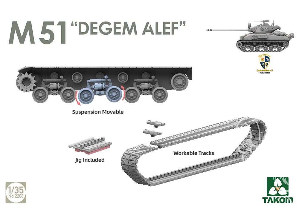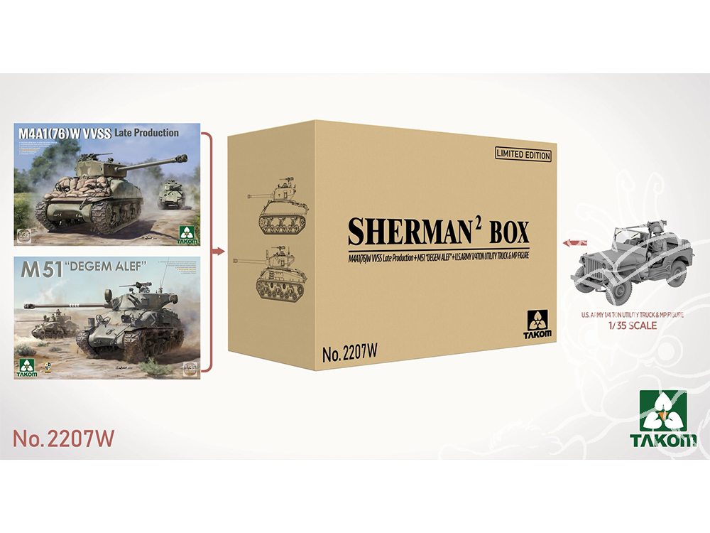 - Edition Limitée reprenant les 2 kits de Sherman / M51 "DEGEM ALEF" Takom (2207 + 2208) + une Jeep de l'U.S. Army 1/4 Ton avec figurine 1/35.