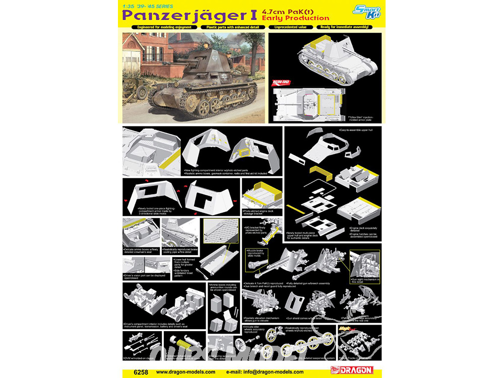 Le dernier kit plastique à l'échelle 1/35 de Dragon montre une version Early Production du Panzerja"ger I 4.7cm PaK(t). En tant que tel, le kit représente un véhicule construit par Alkett en 1940, caractérisé par un véhicule blindé à cinq côtés. Le compartiment de combat est créé par Dragon à l'aide d'un tout nouveau moule coulissant tridirectionnel. Non seulement ce moulage permet tous les détails, mais il intègre également la technologie Razor Edge très appréciée de Dragon pour induire une épaisseur d'échelle au bouclier blindé. Le pont moteur a été correctement réarrangé pour refléter la configuration d'un véhicule de production précoce. Des pièces photogravées sont incluses pour des éléments tels que le couvercle du silencieux d'échappement, tandis que le chasseur de chars comprend des pièces finement détaillées de kits Panzer I précédemment publiés. ger I dispose également d'un ensemble de pistes magiques faciles à assembler. Dans l'ensemble, Dragon a fourni aux modélistes un chasseur de chars beaucoup plus efficace pour leur prochain projet !
