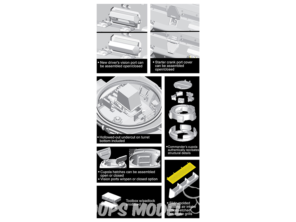 Les trappes latérales de la tourelle peuvent être assemblées ouvertes/fermées avec des détails intérieurs