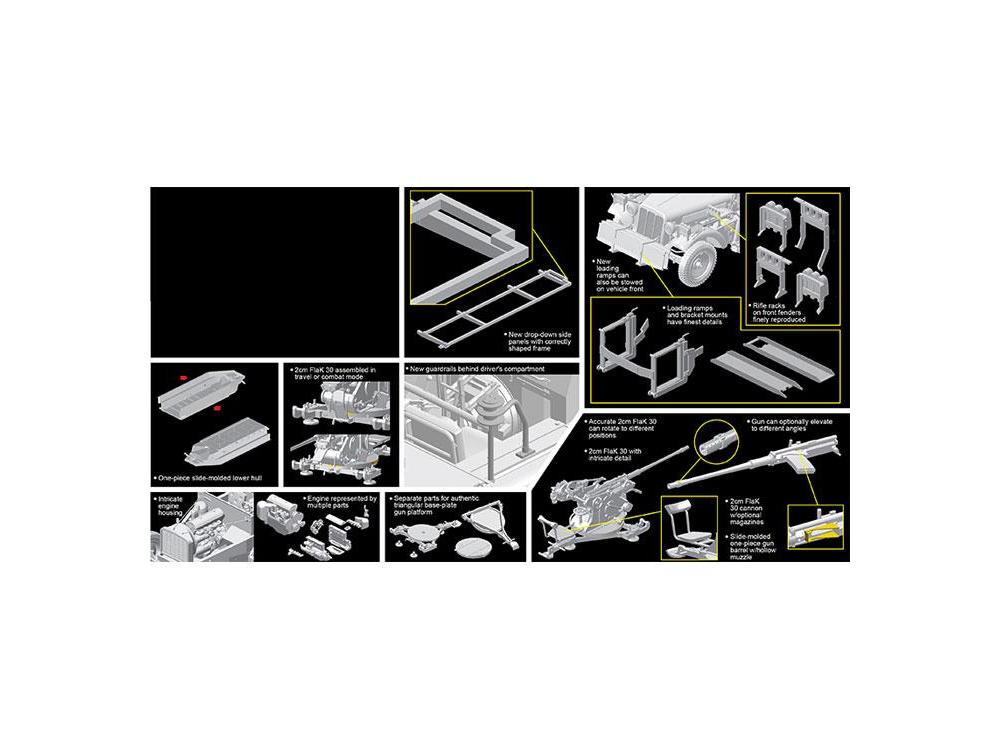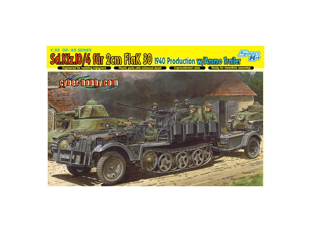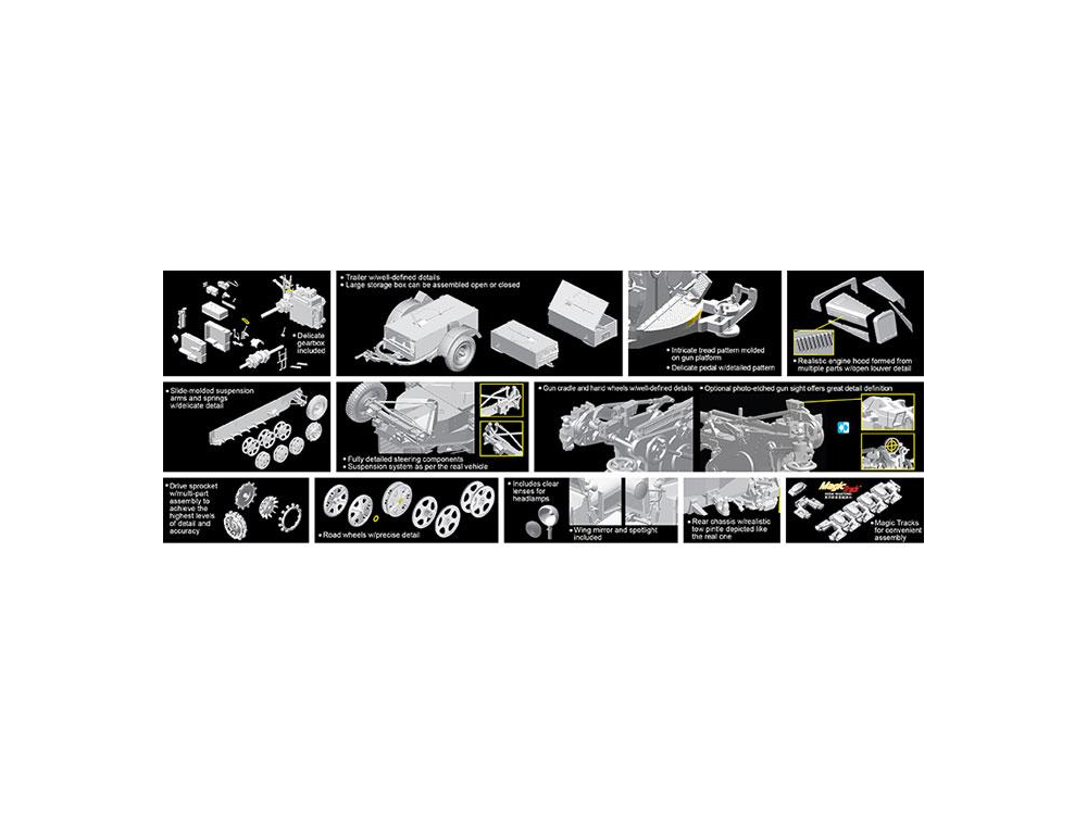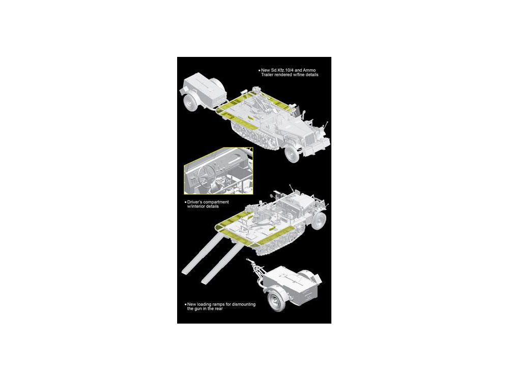 Dragon a maintenant élargi la famille avec un Sd.Kfz.10 / 4 tractant la remorque de munitions standard. Composants internes très détaillées, et même cachés comme le moteur et la boîte sont fournis. Roues de route améliorée et magic tracks ont abouti à une combinaison spectaculaire half-track / remorque. En outre, le kit est livré avec une série de nouvelles pièces comme les rampes de chargement qui peut être soit assemblés pour démonter le canon à l'arrière ou mises en avant du véhicule. En outre, il reçoit de nouvelle poignée des deux côtés. Conçu pour frapper les avions volant à basse altitude Allied, et avec beaucoup de munitions inutilisées disponibles dans la remorque, ce véhicule sera également un succès auprès des modélistes!