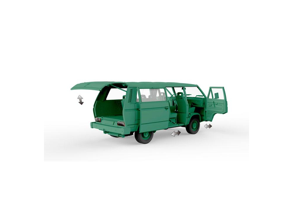 Version militaire du combi Volkswagen produit depuis 1979. Il est utilisé par la Bundeswehr pour le transport de personnel. 1 figurine de soldat Allemand accompagne le kit.