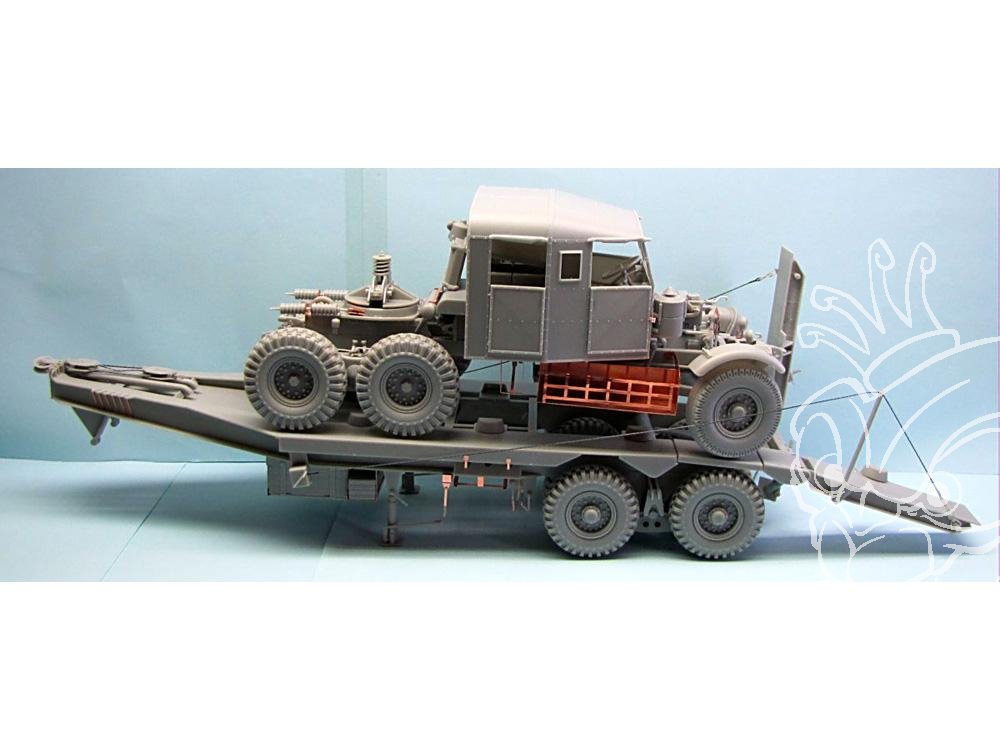 Le Scammell Pioneer était un tracteur britannique 6x4 utilisé pendant la Seconde Guerre mondiale comme tracteur d'artillerie, véhicule de récupération et transporteur de chars. Les pionniers achetés par l'armée britannique étaient équipés d'un moteur diesel Gardner 6 cylindres de 102 ch. La production du transporteur de char a commencé en 1937, bien que le prototype fût déjà construit en 1932. La variante de production était équipée d'un châssis plus long et d'une cabine allongée pour accueillir l'équipage comme passagers et des roues arrière plus grandes que le tracteur d'artillerie . Une remorque Pioneer TRCU20 de 20 tonnes et des tracteurs et remorques Pioneer TRMU30 / TRCU30 de 30 tonnes ont été livrés dans les deux cas avec la remorque fixée au tracteur. Des rampes articulées ont été utilisées pour mettre le char sur la remorque, qui pourrait être tirée avec le treuil du tracteur. Les ensembles tracteur / remorque Pioneer sont restés en production pendant toute la guerre, 459 unités produites au total. En plus de nombreux pneus communs à l'époque, ils utilisaient aussi souvent des pneus fabriqués en Ecosse que nous reproduisions dans le kit avec une très légère modification de l'angle de démoulage.