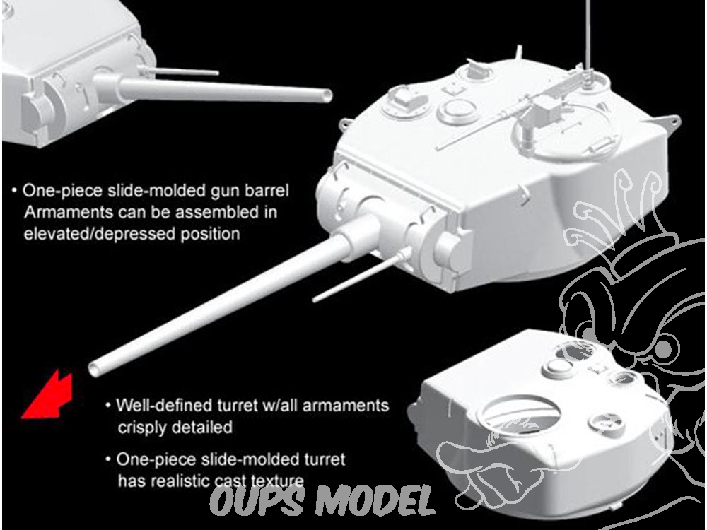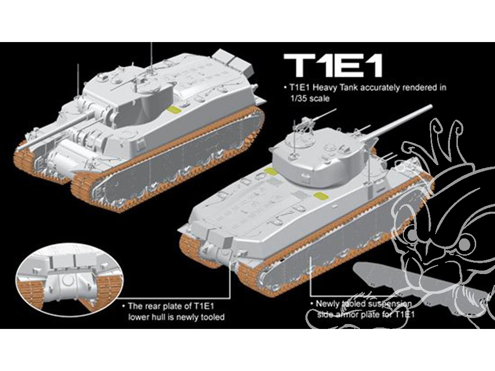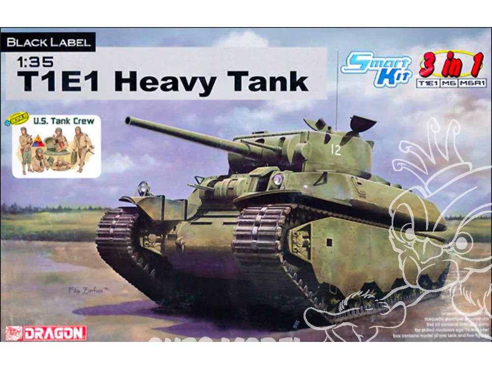 Dans le cadre de sa gamme de kits en plastique Back Label, Dragon a créé un splendide kit à l’échelle 1/35 du Heavy Tank T1E1. Black Label propose déjà des kits des M6 et M6A1 à la même échelle, ce qui en fait un complément utile à cette famille intéressante de chars US. Le kit comprend une coque supérieure flambant neuve avec des détails de pont moteur différents des M6 et M6A1. et nouvelle plaque arrière de coque inférieure. Les détails sont restitués avec soin et tout s'emboîte facilement. De plus, un ensemble de figurines d’équipage de chars américains est inclus dans BONUS. C'est l'occasion idéale de rassembler et de compléter ce trio de heavy metal américain! En réalité, ce kit est une version 3 en 1, composée de pièces pour la construction de T1E1, M6 ou M6A1.