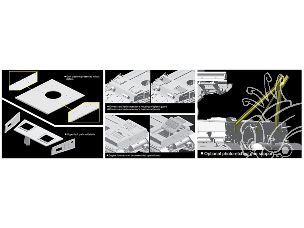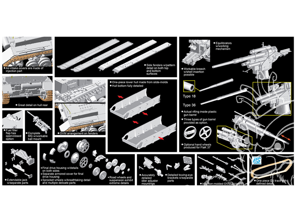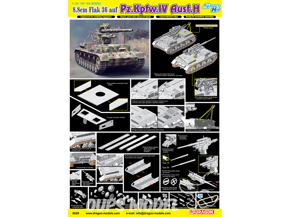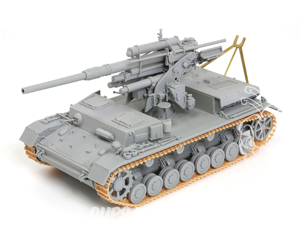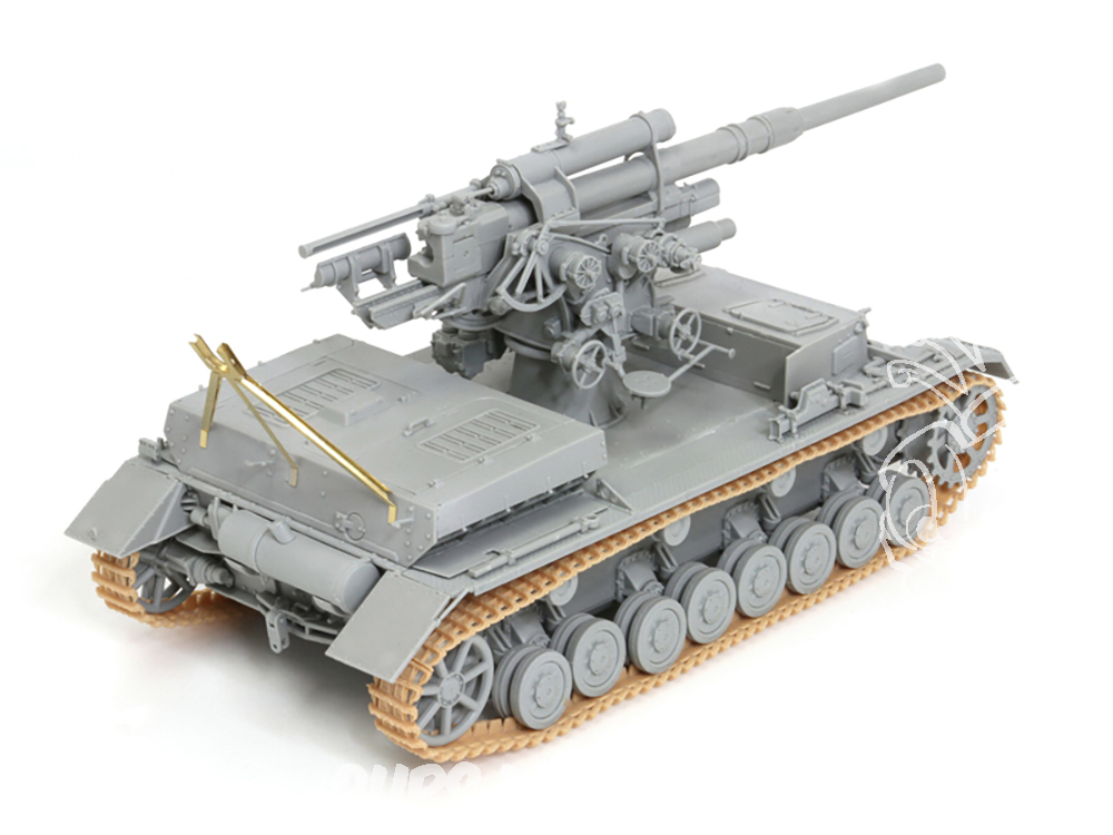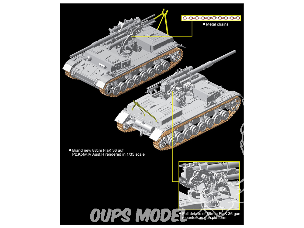 Comme on pouvait s'y attendre pour ce kit hybride, l'équipe technique de Dragon a pris les kits 1/35 exemplaires de la société des canons Panzer IV H et FlaK 36 et les a magistralement combinés en une seule représentation étonnante. Bien sûr, la coque du réservoir a été modifiée de manière appropriée dans le processus pour faire écho aux plans des ingénieurs d'origine. Le pistolet de 8,8 cm lui-même est une œuvre d'art. Il y a des pièces photogravées pour représenter des composants tels que le verrou de voyage du pistolet. Le FlaK 36 auf Pz.Kpfw.IV Ausf.H de 8,8 cm n'était pas une arme régulière qui est entrée en production pour la Wehrmacht, mais les modélistes s'amuseront amplement à produire leur propre version de cette arme antiaérienne allemande inhabituelle.