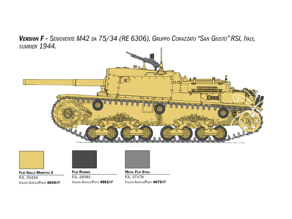 L'armée royale, dans les années précédant la Seconde Guerre mondiale, a exprimé le besoin de disposer d'unités d'artillerie mécanisées capables d'appuyer l'infanterie et les unités blindées. Le 75/18 automoteur a été développé sur la coque du char moyen "M", qui s'est avéré être le véhicule blindé italien le plus redouté par les alliés pendant le conflit. En fait, grâce à son obusier de 75 mm installé dans la casemate, il s'est avéré être une arme antichar efficace capable d'anéantir même les chars britanniques et américains les plus puissants et les plus lourdement blindés.Pendant la guerre, cependant, l'armée royale a demandé le développement d'une version à capacité offensive accrue. Le canon 75/34 destiné au tir antichar fut alors installé sur la caisse du char automoteur M42. Les premiers exemplaires furent distribués aux départements italiens au printemps 1943. Grâce à ses bonnes performances opérationnelles, après l'armistice de septembre 1943, il fut également utilisé par les départements allemands de la Wehrmacht.Décalques POUR 6 VERSIONS