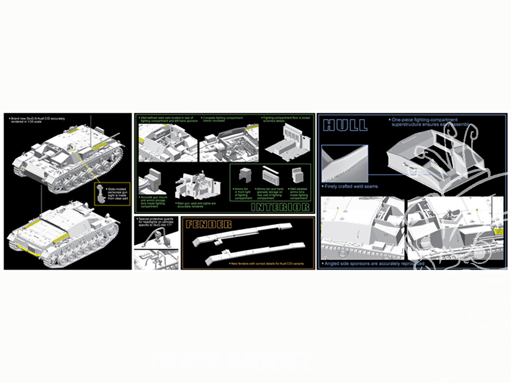 Dragon a eu une réponse phénoménale pour son tout nouveau kit StuG.III Ausf.E à l'échelle 1/35 (article n ° 6688), à tel point qu'il a incité la sortie de versions encore plus anciennes à canon court. En fait, Dragon propose un kit comprenant l'Ausf.C/D. Le Sturmgeschütz III (StuG.III) a la particularité d'être l'AFV le plus produit en Allemagne pendant la Seconde Guerre mondiale, avec 10 619 exemplaires fabriqués. Basé sur le châssis du Panzer III, il était moins cher et plus rapide à construire car il n'avait pas de tourelle rotative. Seuls 50 Ausf.C ont été construits en 1941. Le StuG.III Ausf.D était identique à son prédécesseur à l'exception de l'installation d'un système d'interphone. Au total, 150 Ausf.D ont été construits de mai à septembre 1941.