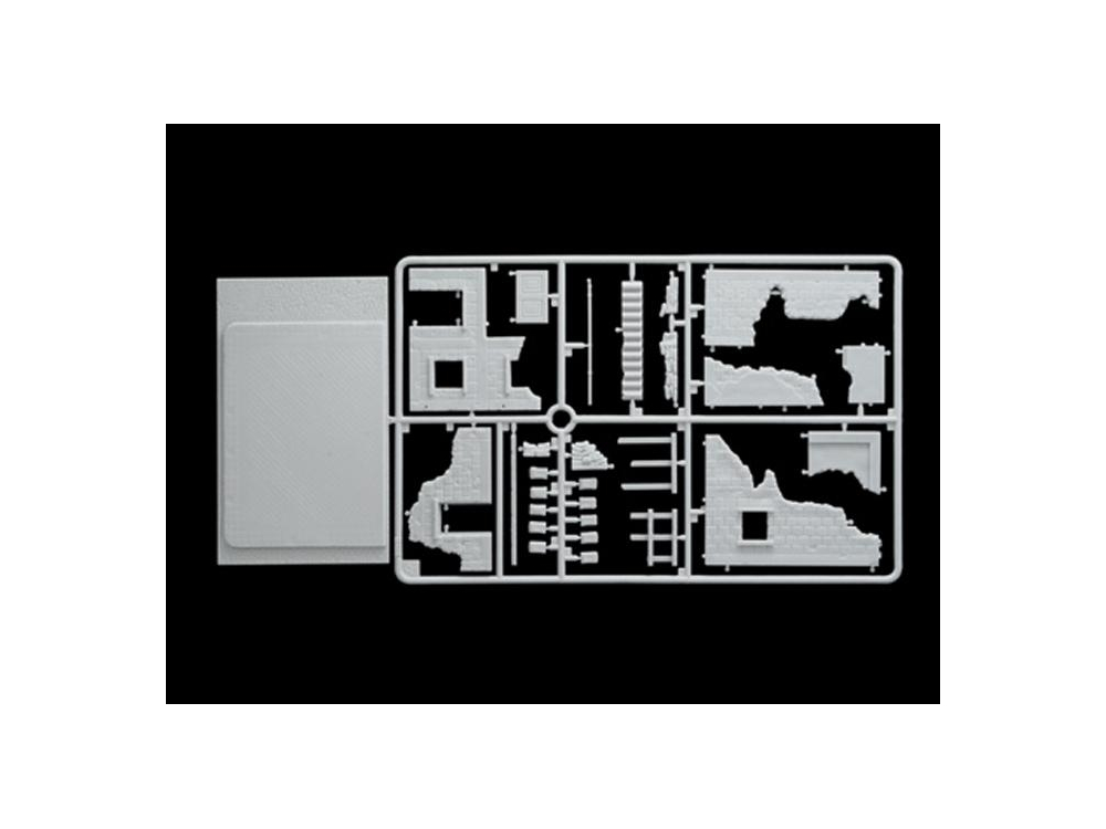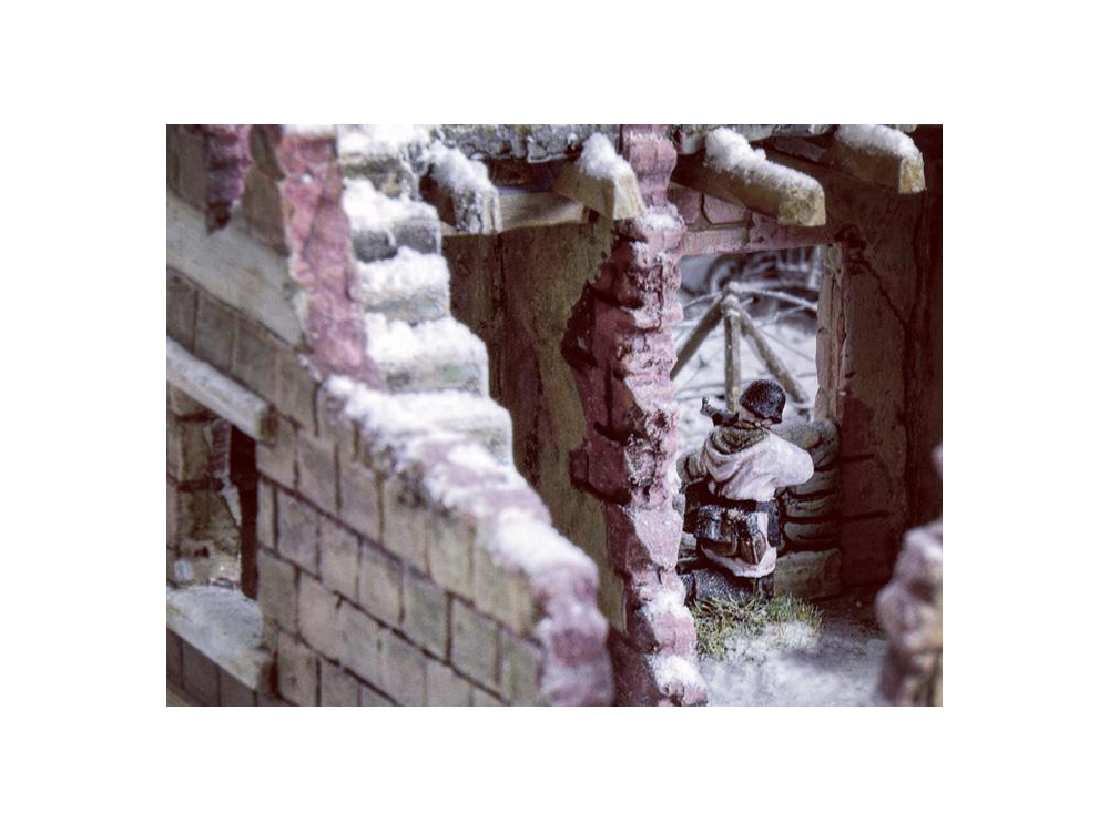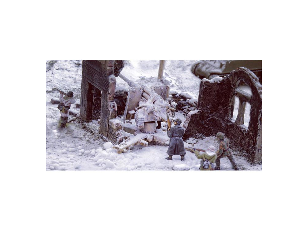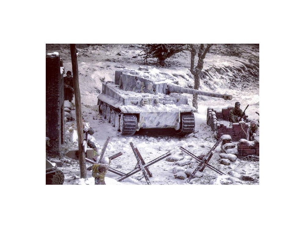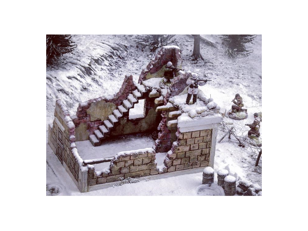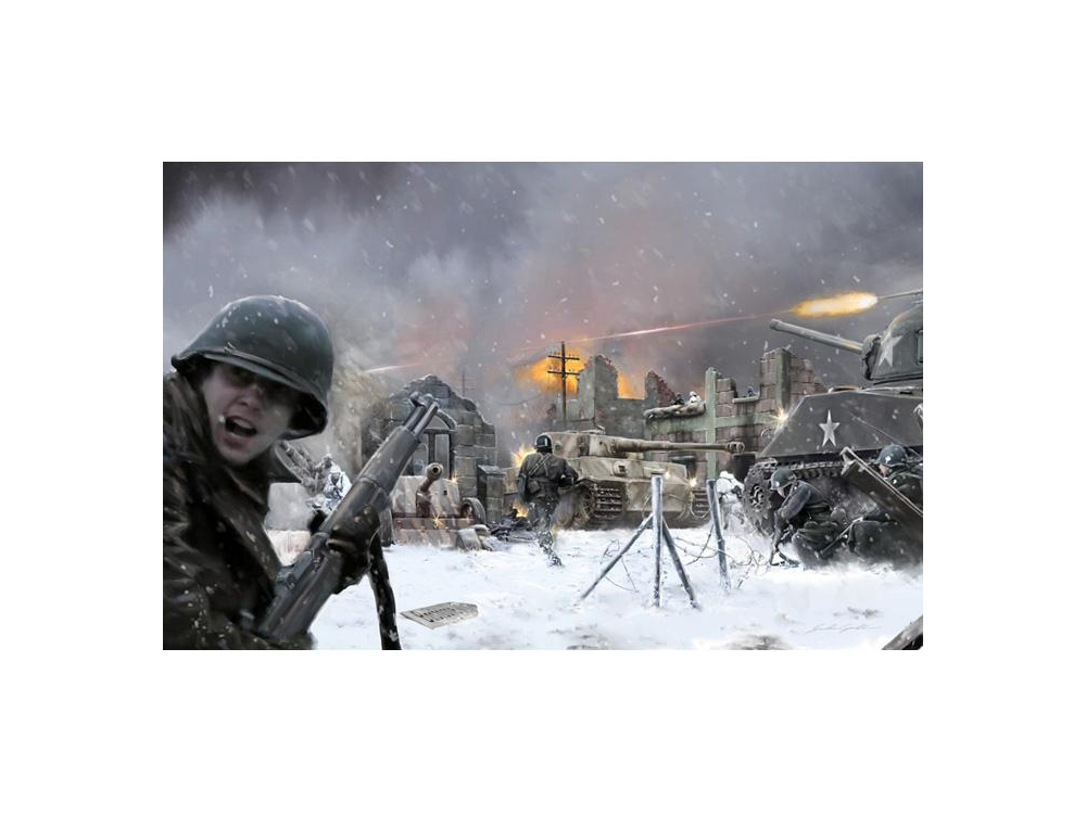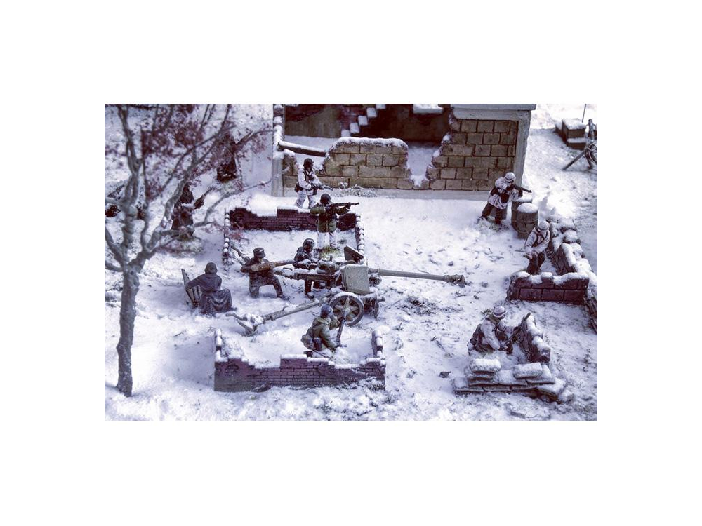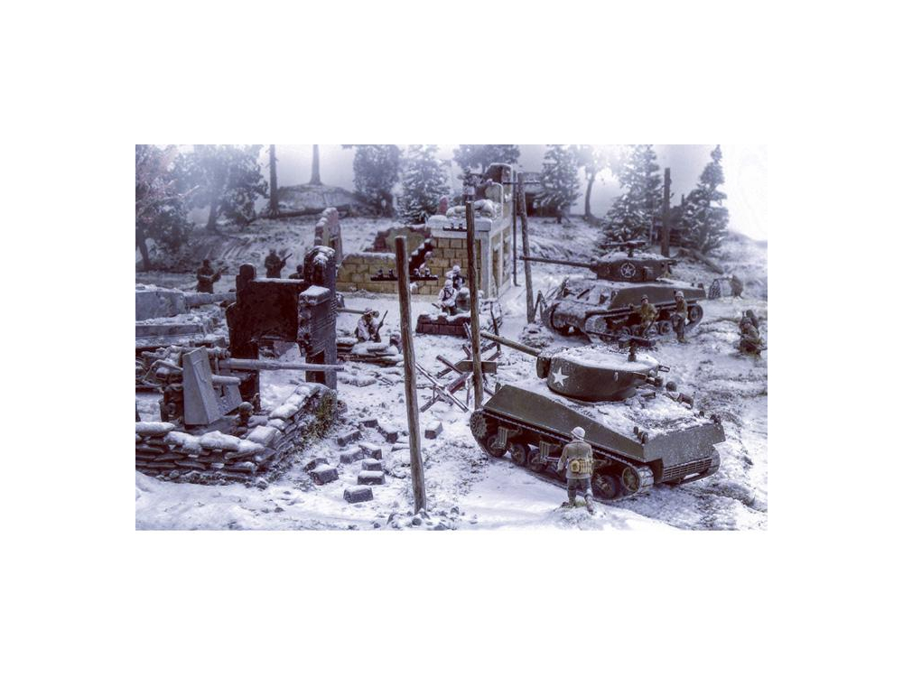 Maison en ruine - Set de murs et ruines - Accessoires de champ de bataille - Fantassins allemands en tenue hivernale (24 pcs) - Fantassins US en tenue hivernale (36 pcs)- Sherman M4A3E2 Jumbo - Sherman M4A3 76mm - Pz. Kpfw. VI Tiger Ausf.E - Canon anti-char Pak 40 avec 6 servants - Canon 8.8 cm Flak 37.