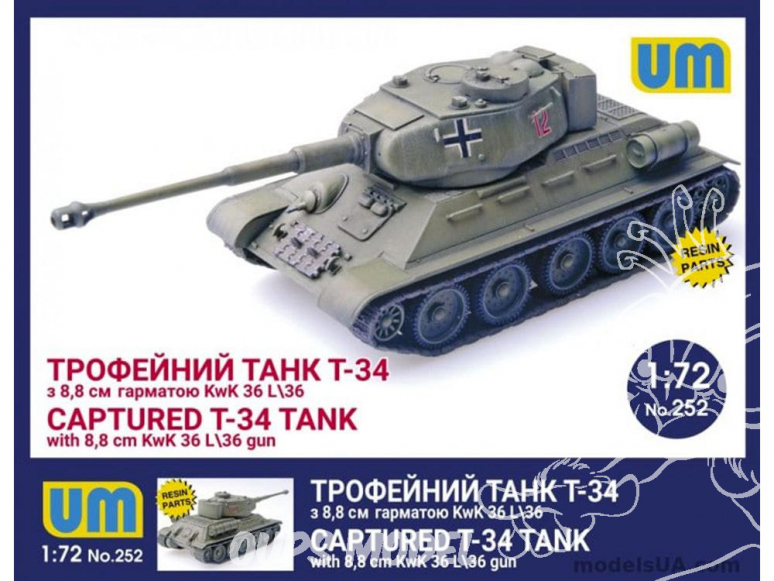 CHAR T-34 CAPTURÉ  équipé d’un CANON de 8.8 cm KwK 36L/36 (expérimentation Armée Allemande) 1/72 Unimodels UM maquettes militaire 252